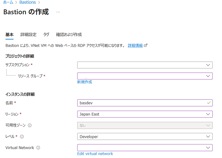 [詳細設定]タブのBastionの機能はDeveloper SKUの制限通りで変更することはできずグレーアウトされています。