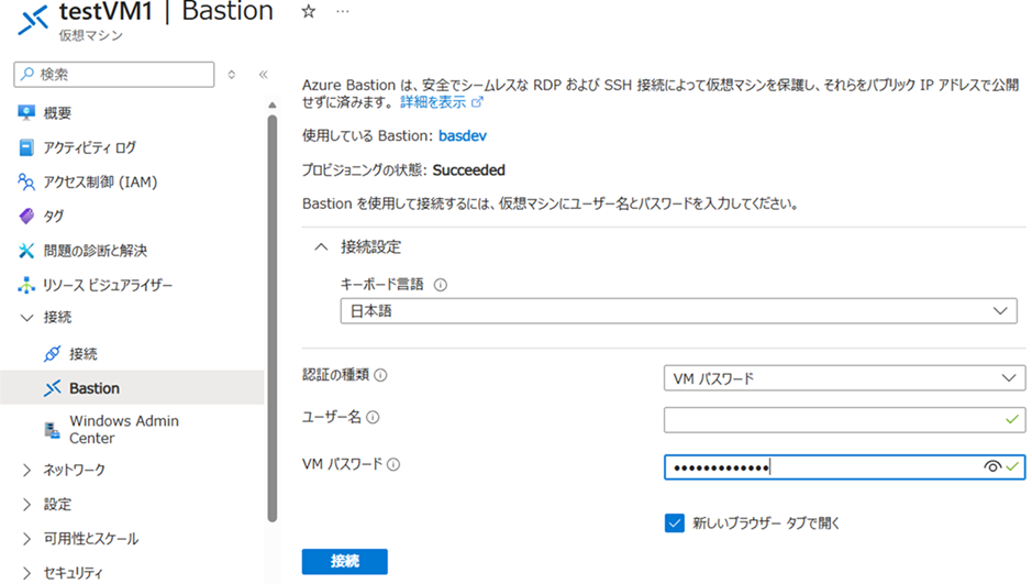 別途仮想マシンtestVM1とtestVM2を用意し、作成した「basdev」を用いて仮想マシンにアクセスします。仮想マシンにアクセスするよう設定したユーザー名、パスワードを入力しログインします。
