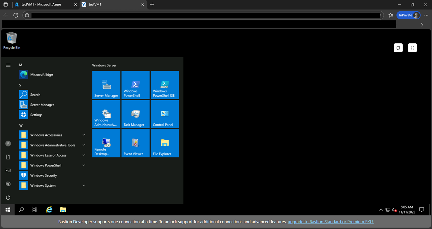仮想マシンtestVM1に接続できました。画面下部に同時接続は1台の警告が表示され画面が少し圧迫されてしまいます。