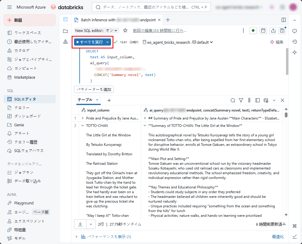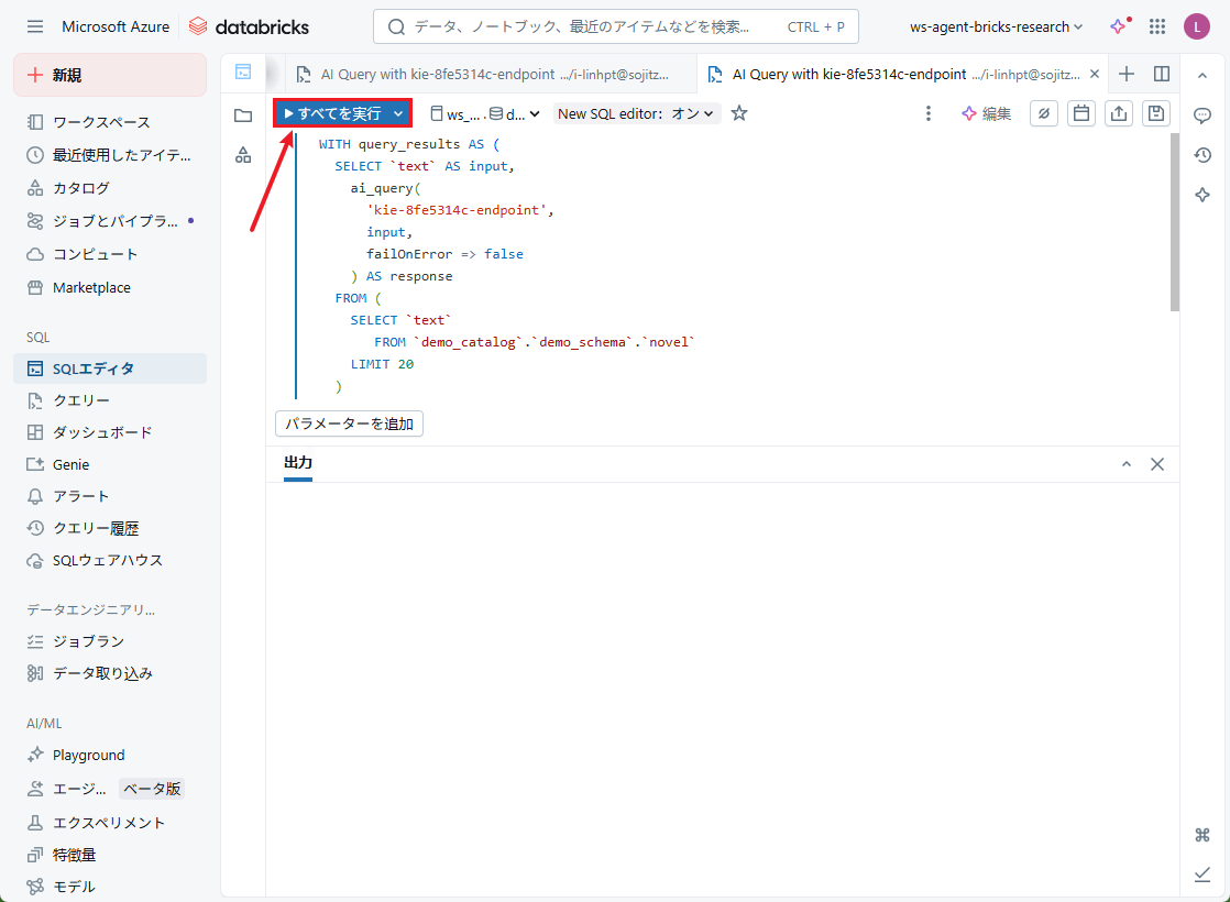 - 「すべてのドキュメントのデータを抽出」:SQLエディタでai_queryを実行して情報を抽出します。