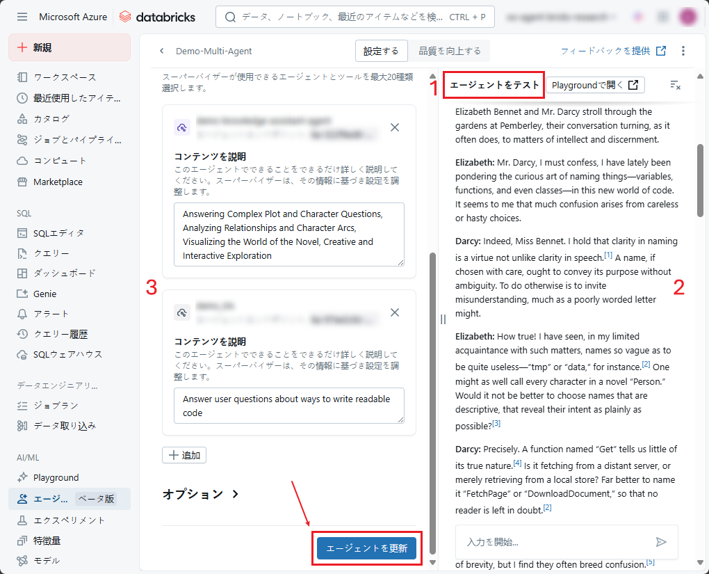 スーパーバイザーのビルドが完了したら、 AI Playground または右側の 「エージェントをテスト」ウィンドウでテストできます。