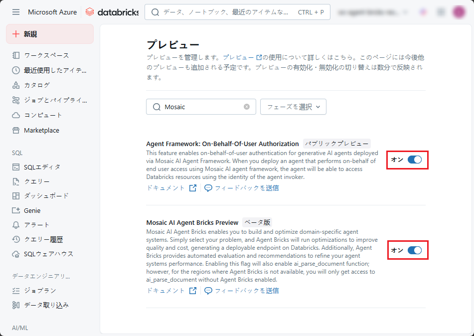 - ワークスペースでMosaic AI Agent Bricks Preview(ベータ版)機能が有効になっていること。