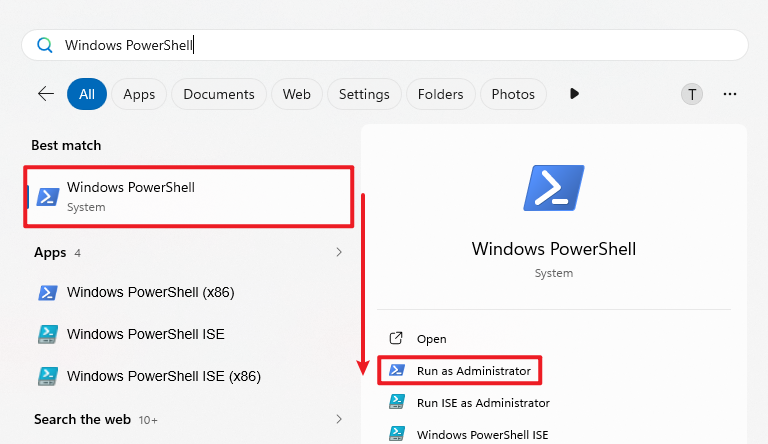 Windowsの検索で「Windows PowerShell」を検索し、右クリックして「Run as Administrator」を選択します。