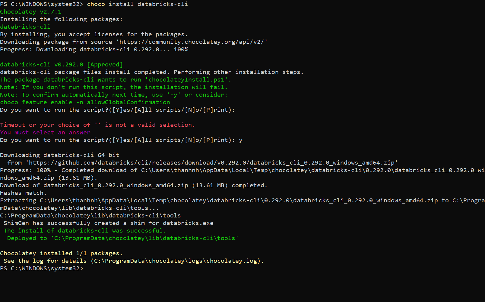② Chocolateyを使用してDatabricks CLIのダウンロード