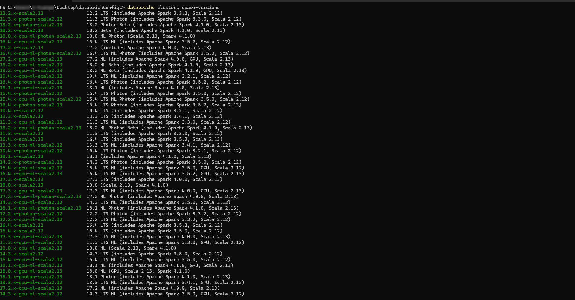 表示されたとおり、このコマンドを実行すると、デフォルトプロファイルに紐づけられたDatabricksワークスペースで利用可能なDatabricks Runtimeの一覧が表示されます。