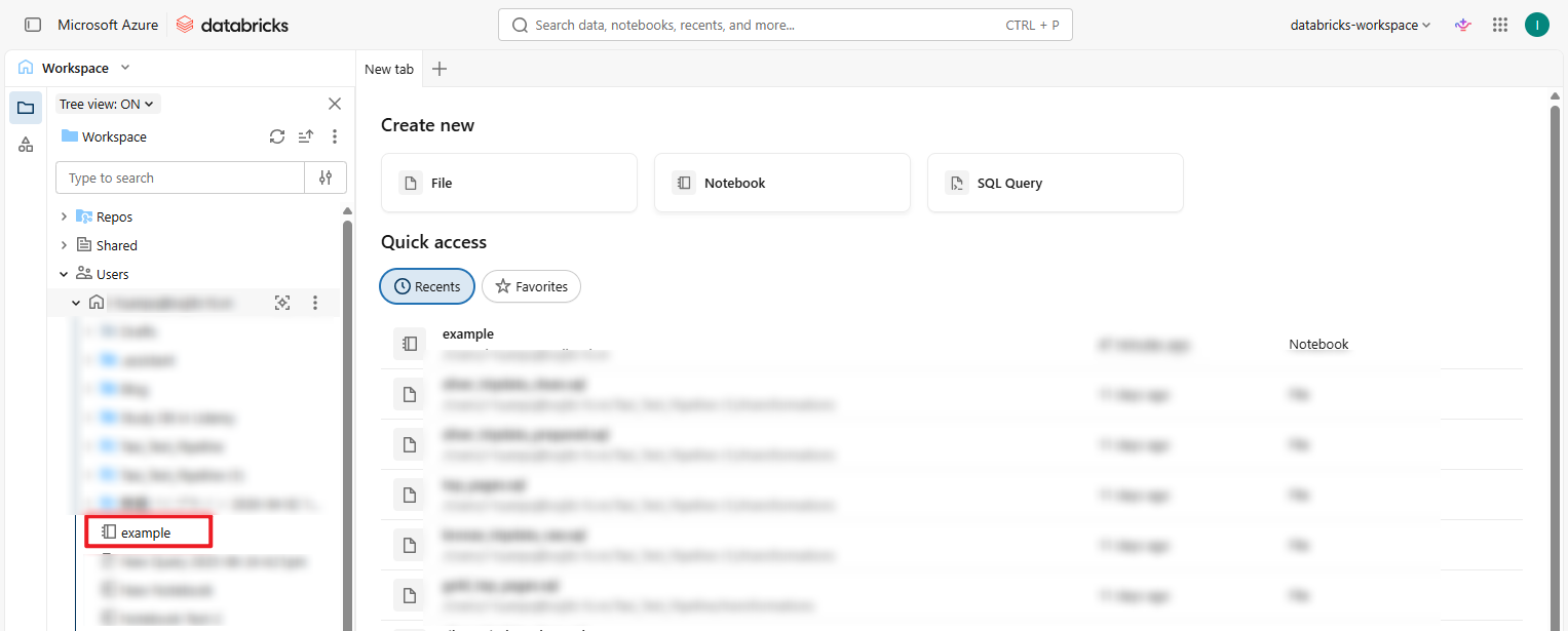 その後、ワークスペース上で確認すると、指定したパスに example Notebook がインポートされていることを確認できます。