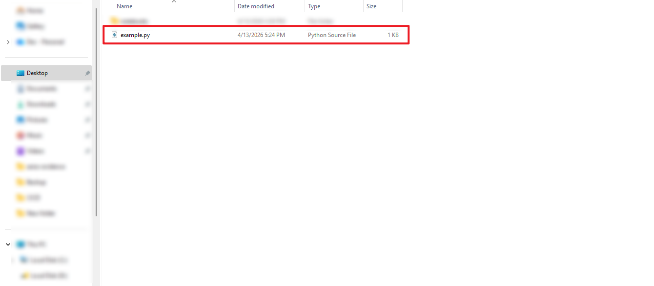 その後、ローカルのフォルダを確認すると、「example.py」ファイルが .py 形式でダウンロードされていることを確認できます。
