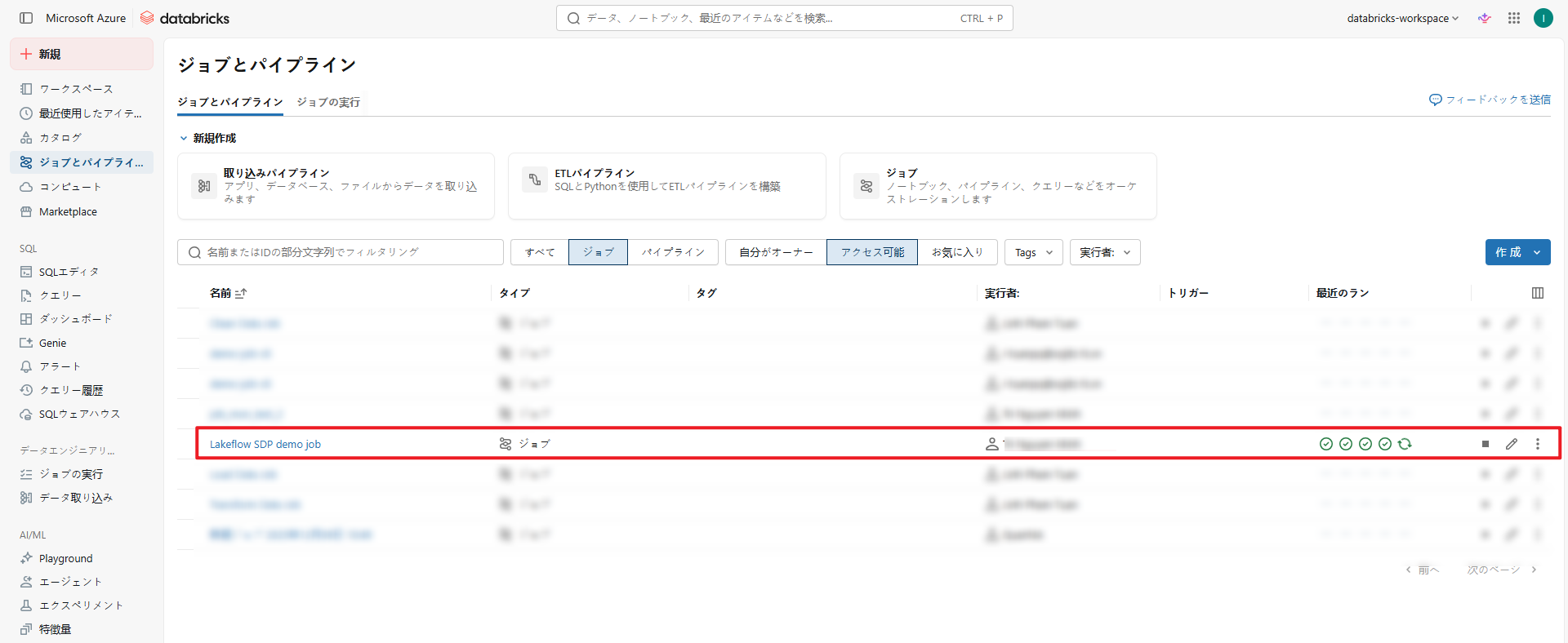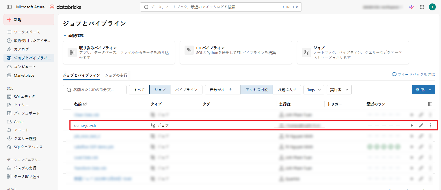 Databricksワークスペース上で確認すると、job.json の設定に基づいた新しいジョブが作成されていることが確認できます。