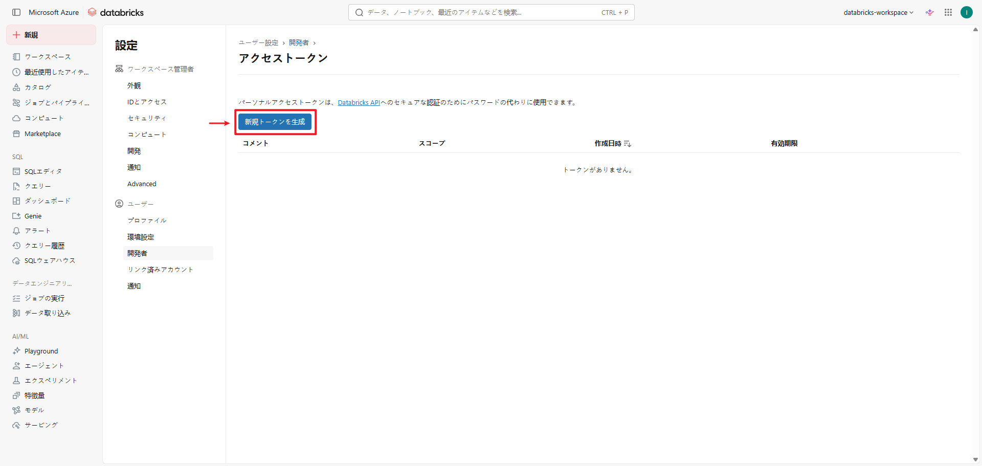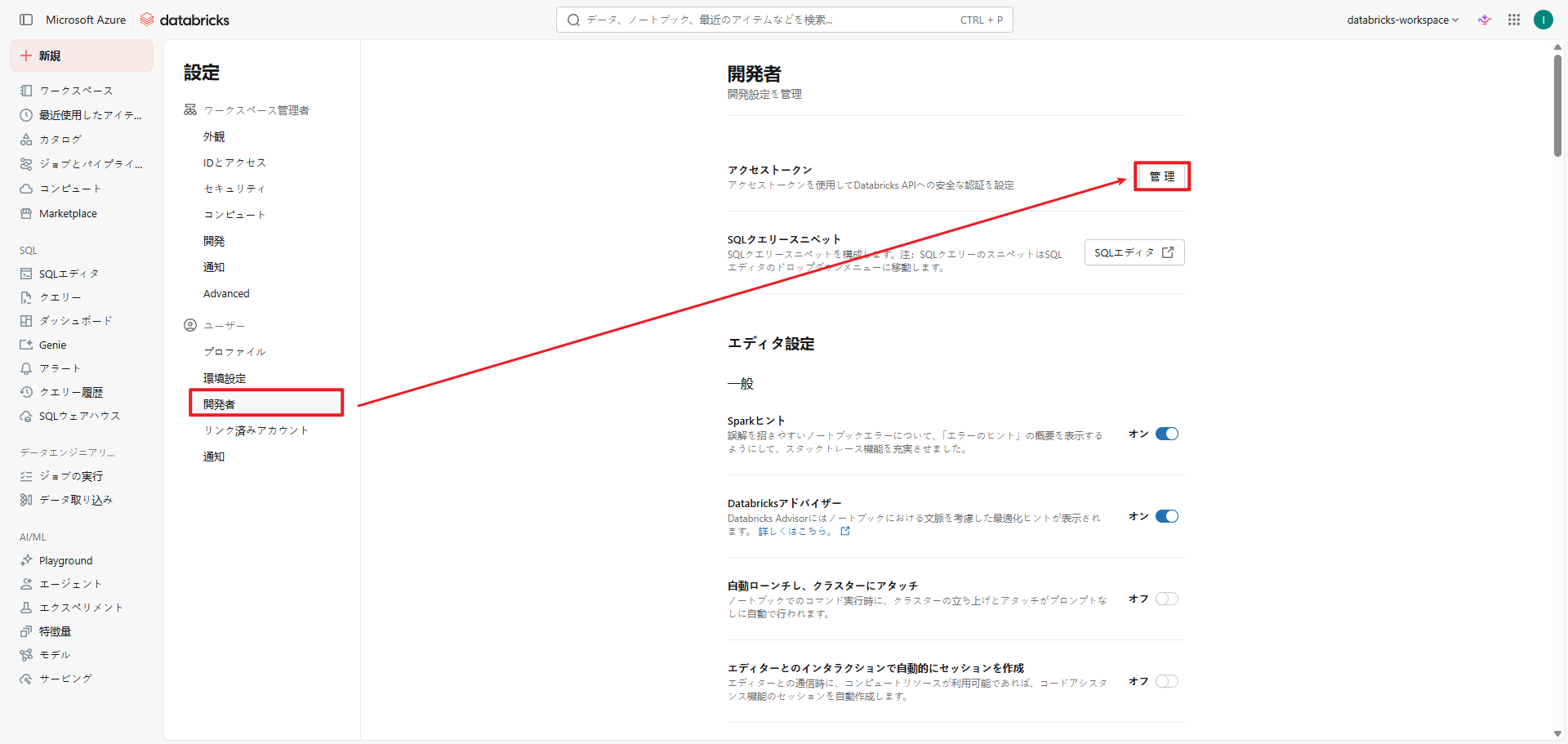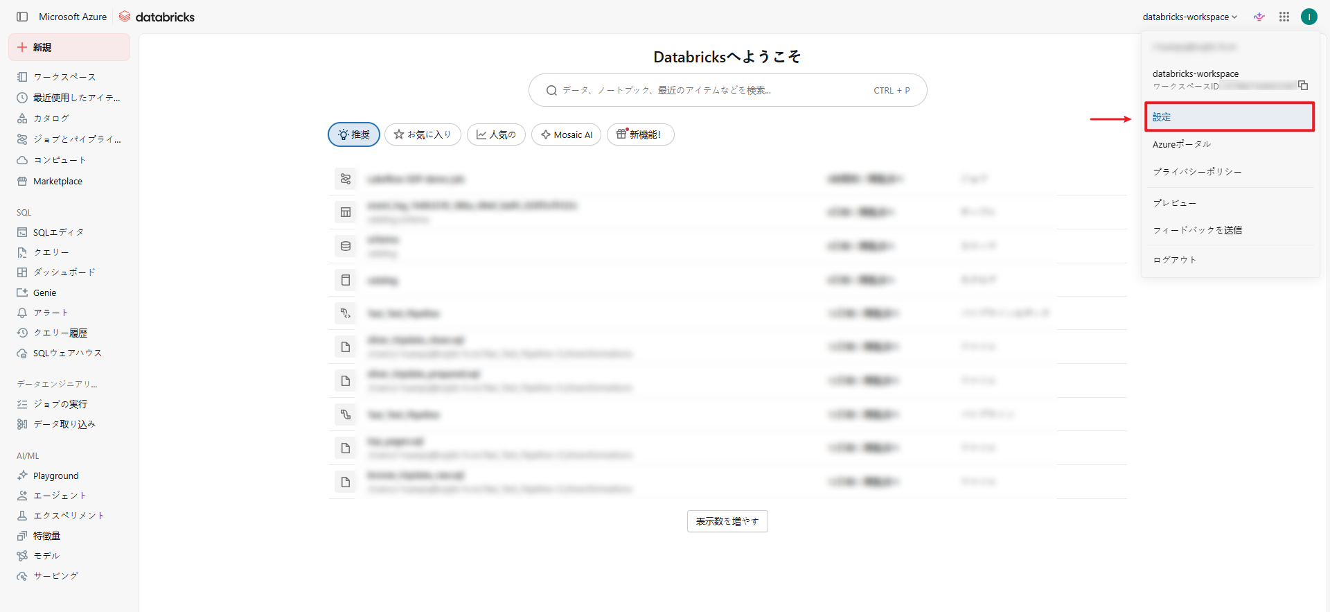 • Databricksワークスペースにアクセスし、 「設定」をクリックします。