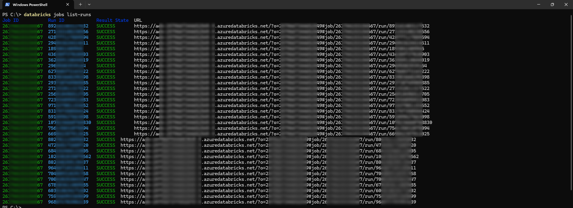 DatabricksのUI(ジョブおよびパイプライン→ジョブ実行)または databricks jobs list-runs コマンドから取得できます。