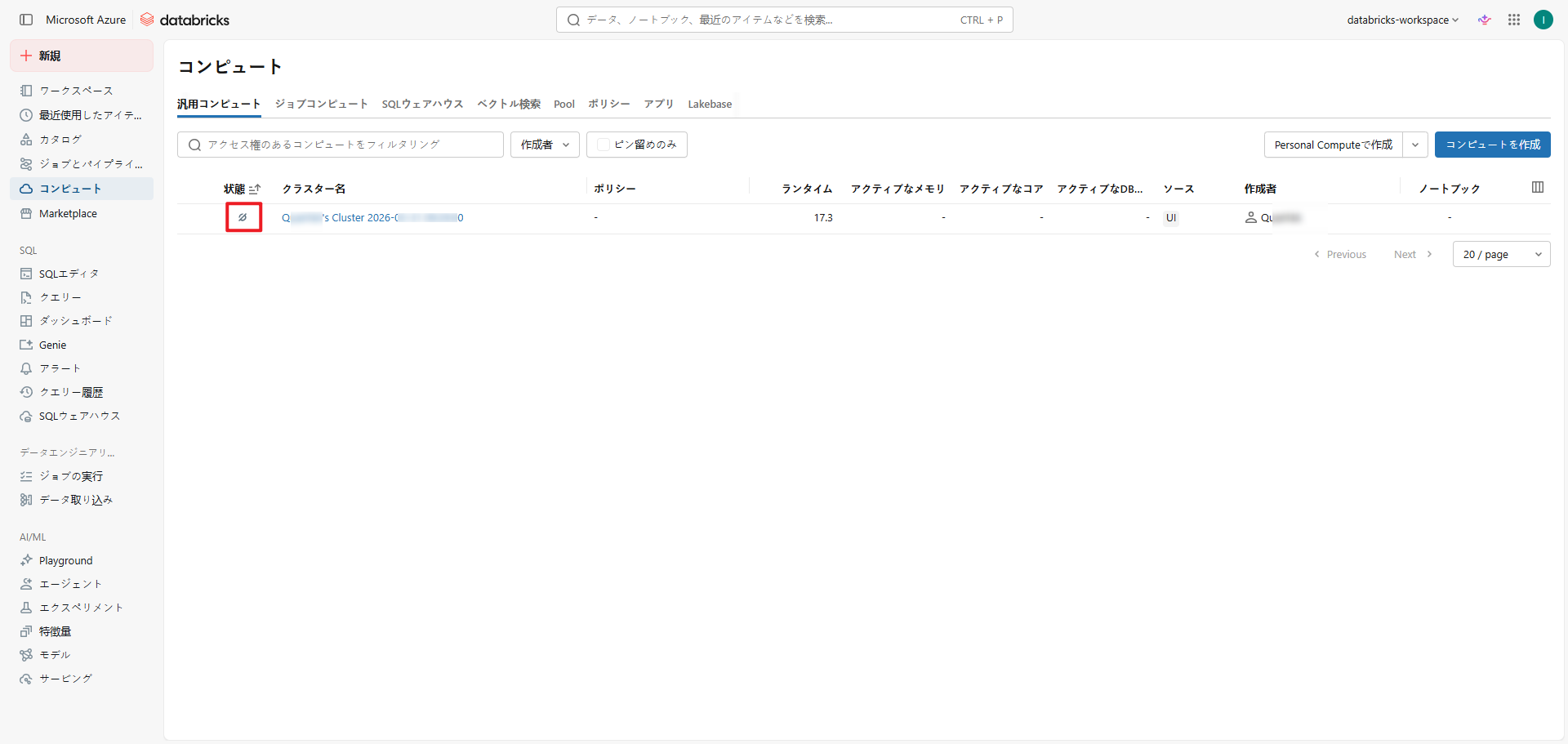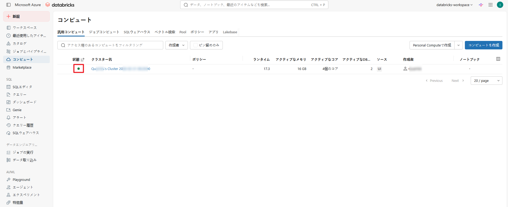ワークスペース上で、クラスターが正常に起動していることを確認できます。