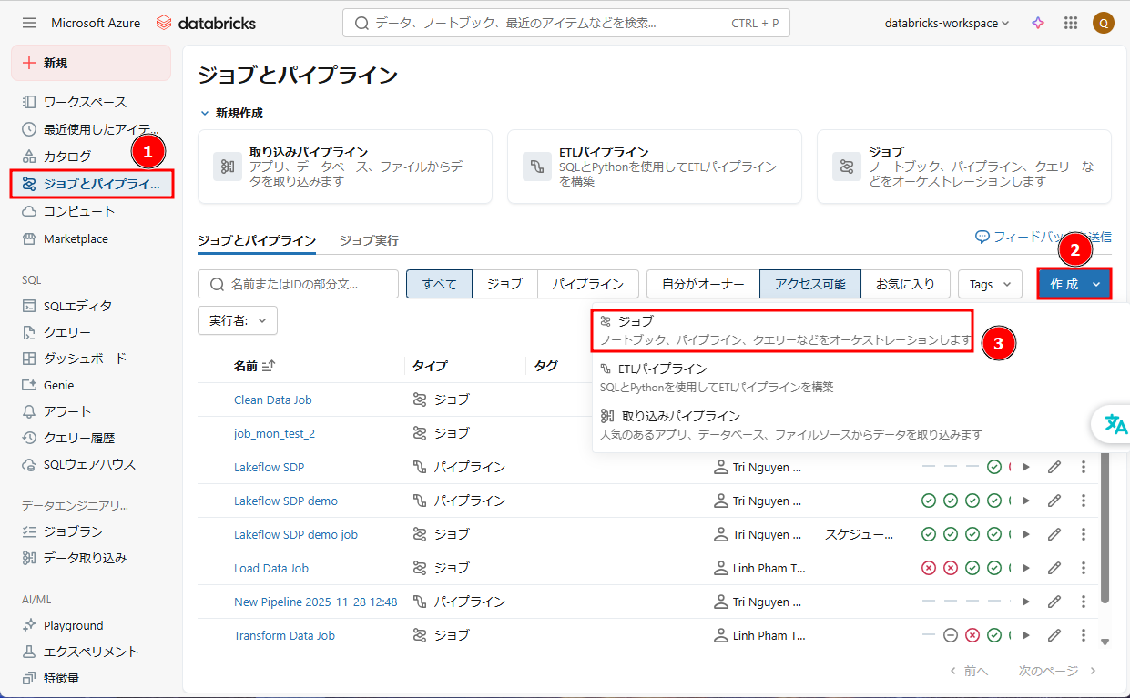 ① Databricksワークスペース画面から、「ジョブとパイプライン」 → 「作成」→「ジョブ」をクリックします。