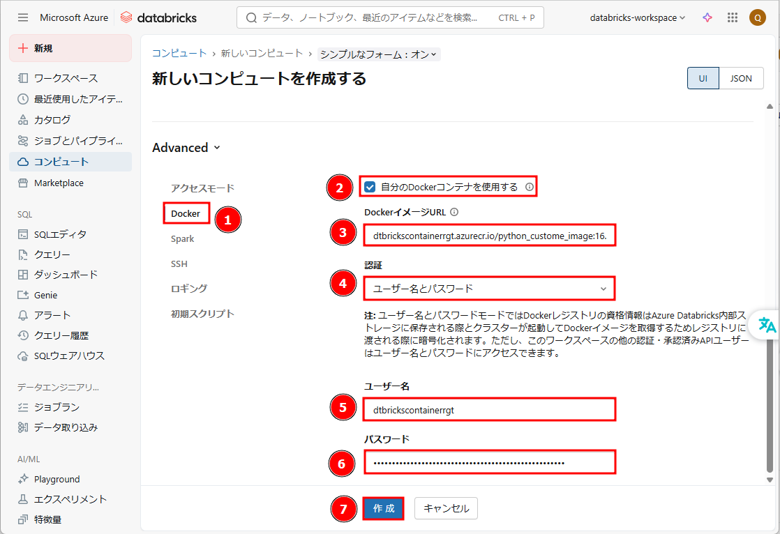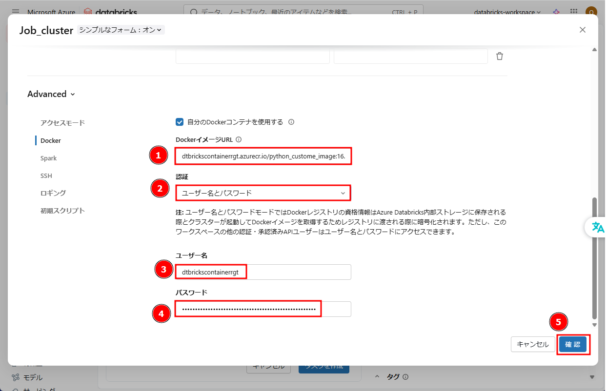 ⑥ ユーザー名とパスワードを入力します。Azureコンテナーレジストリの「アクセス キー」からユーザー名とパスワードを取得できます。