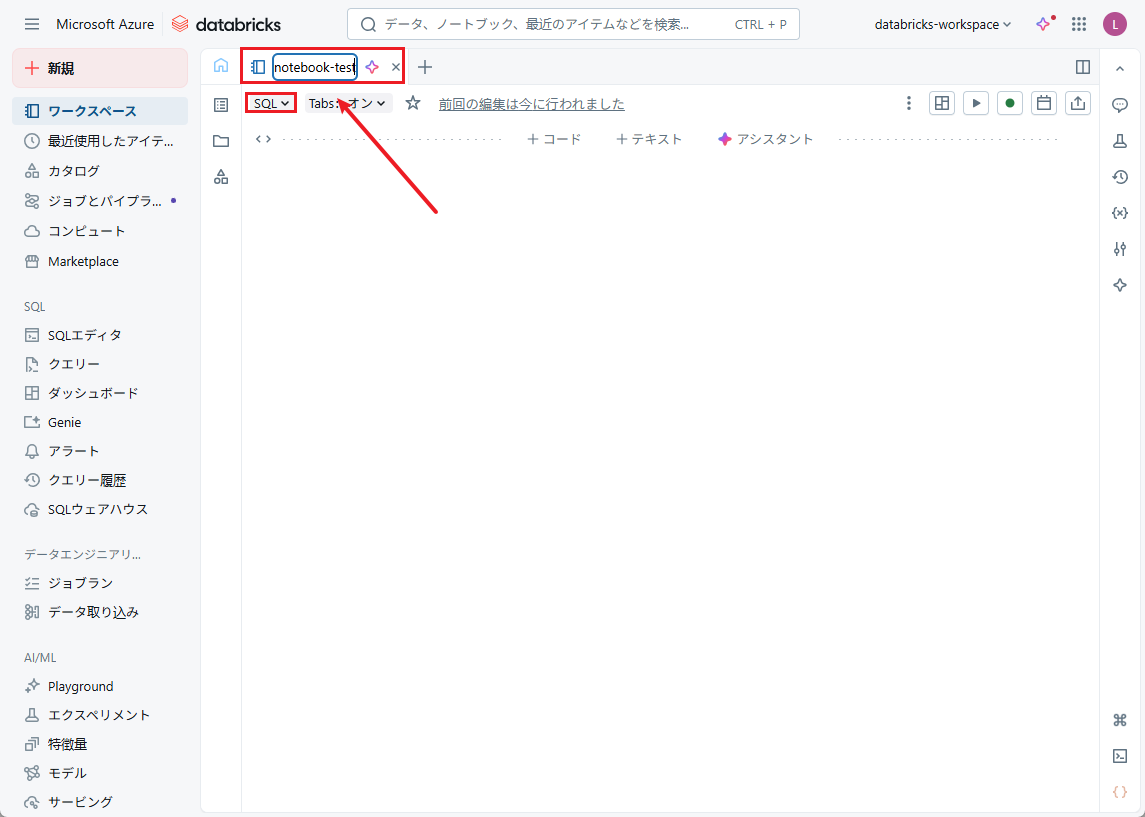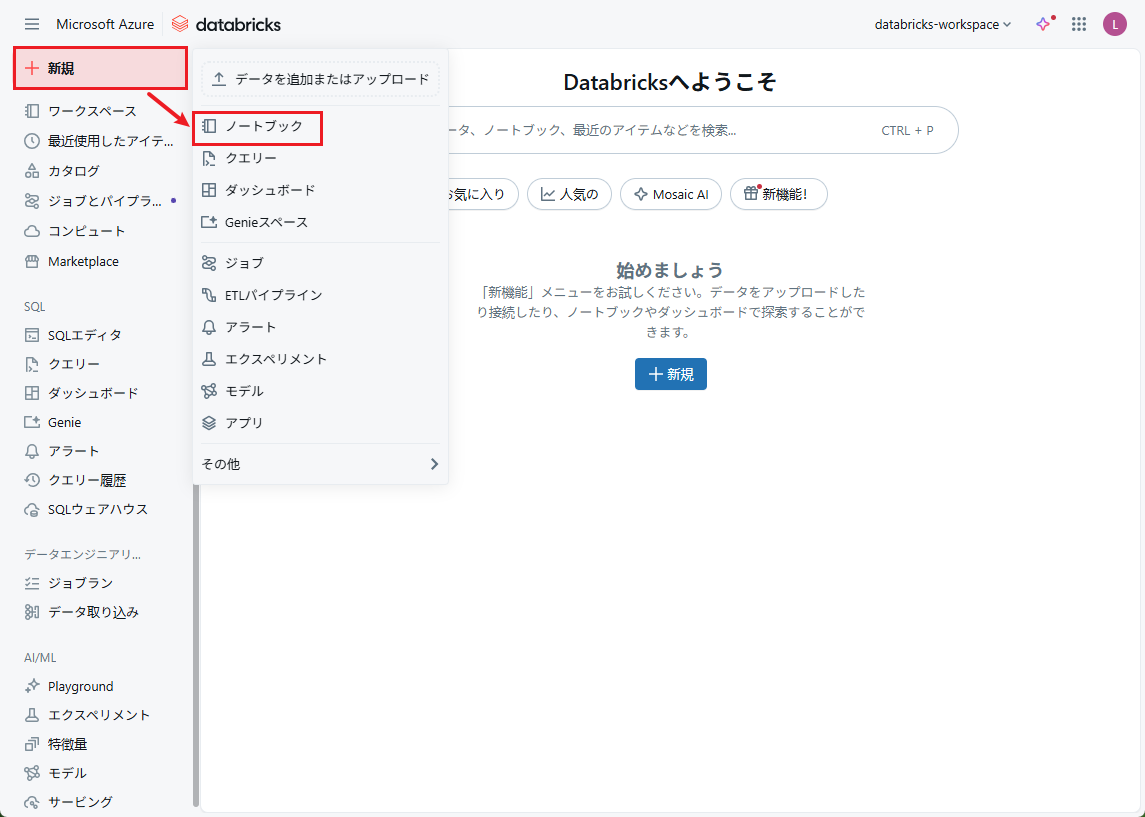 ②Azure Databricksポータル画面で、[+新規]>[ノートブック]を選択します。