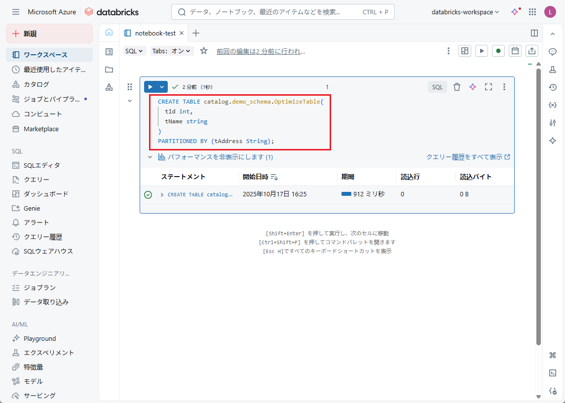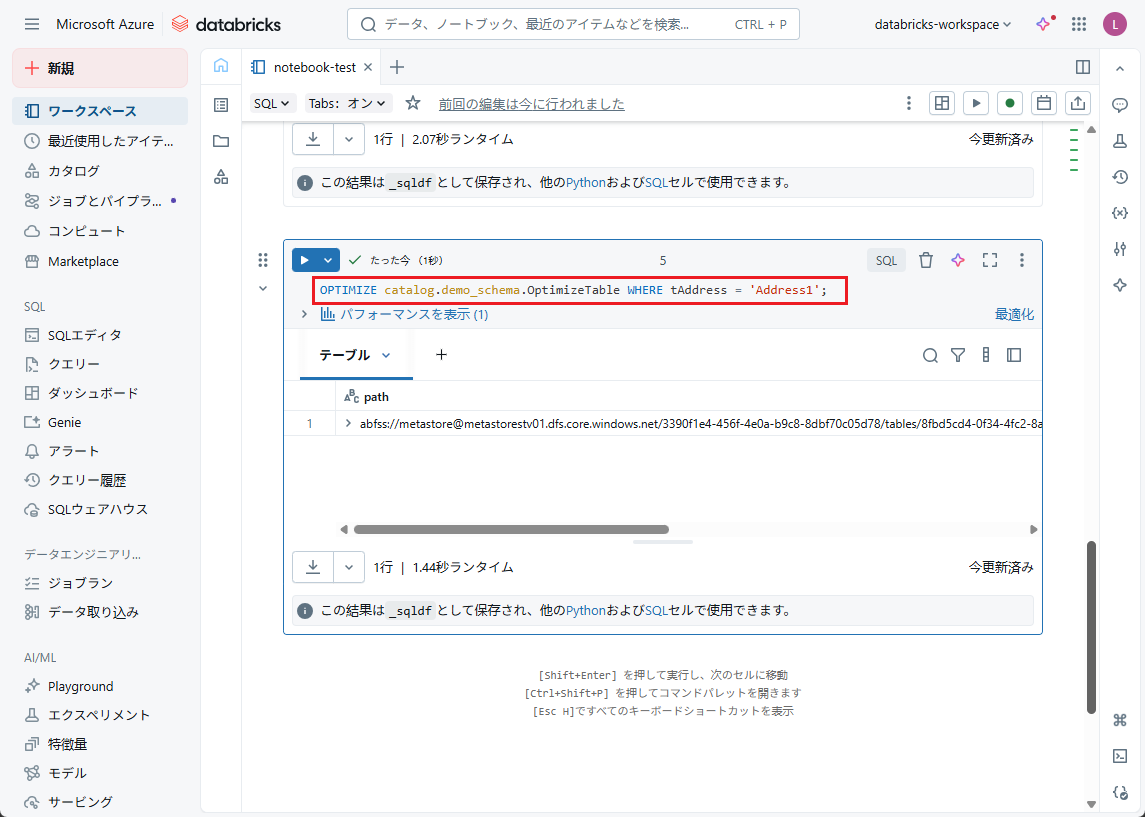 OPTIMIZE catalog.demo_schema.OptimizeTable WHERE tAddress = 'Address1'; |