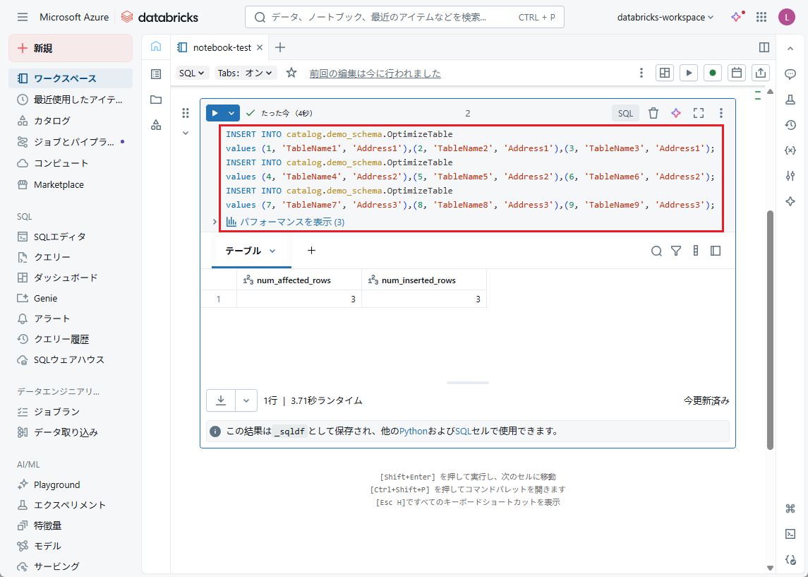 %sql INSERT INTO <カタログ名>.<スキーマ名>.<テーブル名> VALUES (1, ' [値]', '[値]'),(2, '[値]', '[値]'),(3, '[値]', '[値]'); INSERT INTO <カタログ名>.<スキーマ名>.<テーブル名> VALUES (4, '[値]', '[値]'),(5, '[値]', '[値]'),(6, '[値]', '[値]'); INSERT INTO <カタログ名>.<スキーマ名>.<テーブル名> VALUES (7, '[値]', '[値]'),(8, '[値]', '[値]'),(9, '[値]', '[値]'); |