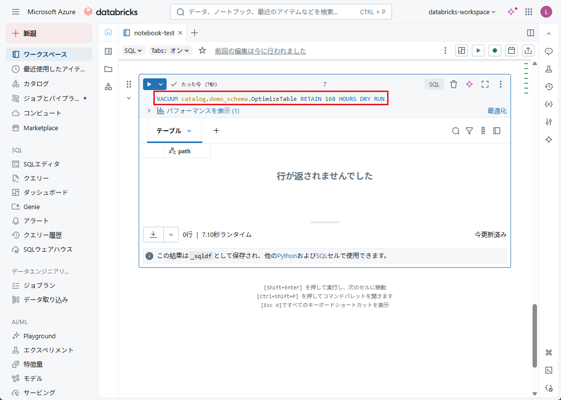 VACUUM <カタログ名>.<スキーマ名>.<テーブル名> [RETAIN 数 HOURS] DRY RUN |