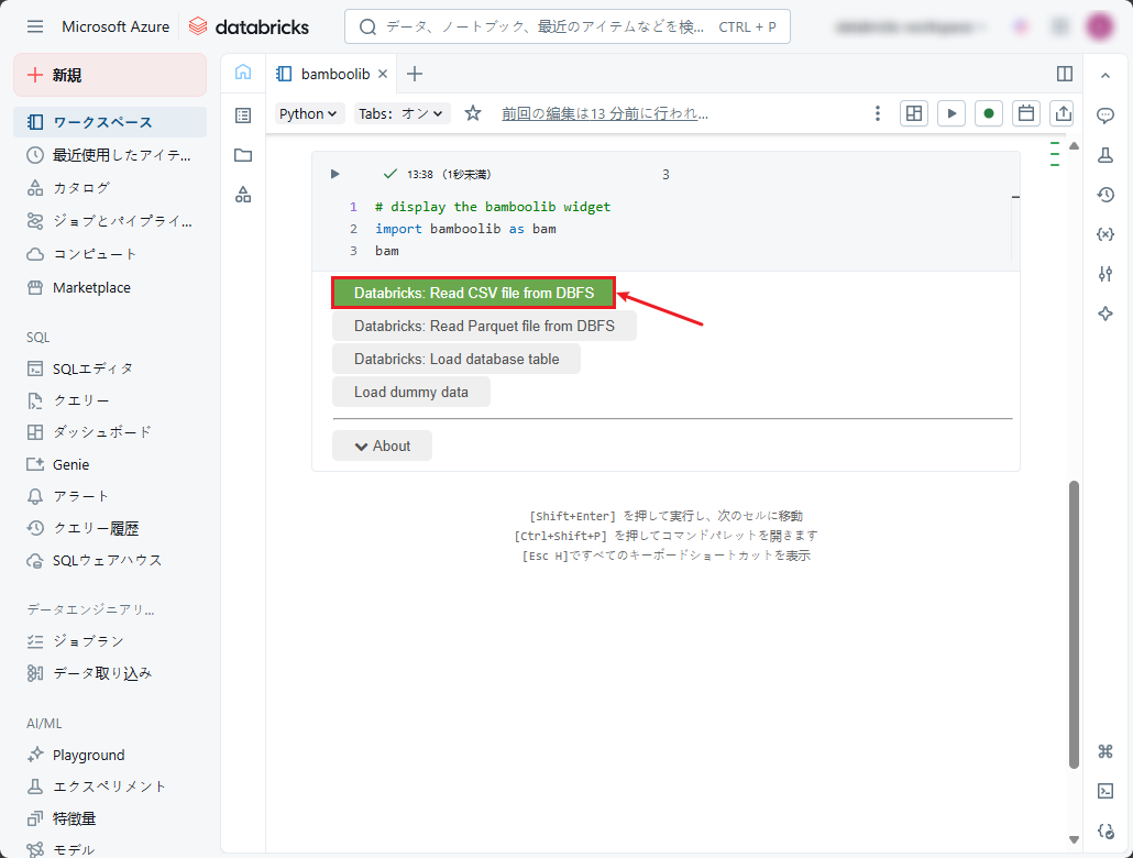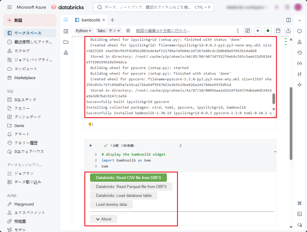 ⑤ 実行後、bamboolibライブラリがインストールされ、bamboolibウィジェットが表示されます。