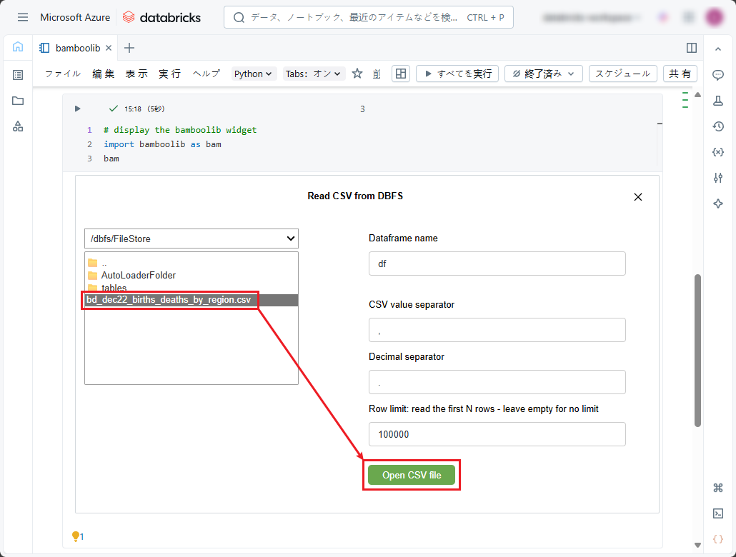 ②「Read CSV from DBFS」ダイアログボックスで、前の手順でDBFSにアップロードしたCSVファイルを選択し、「Open CSV file」ボタンをクリックします。
