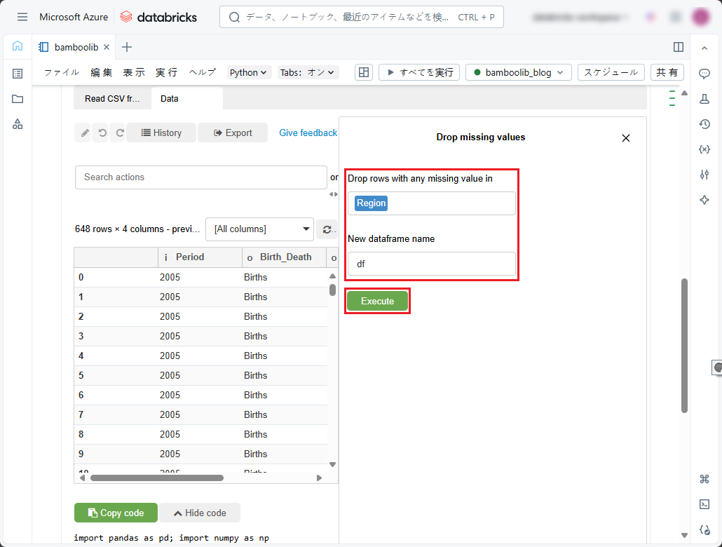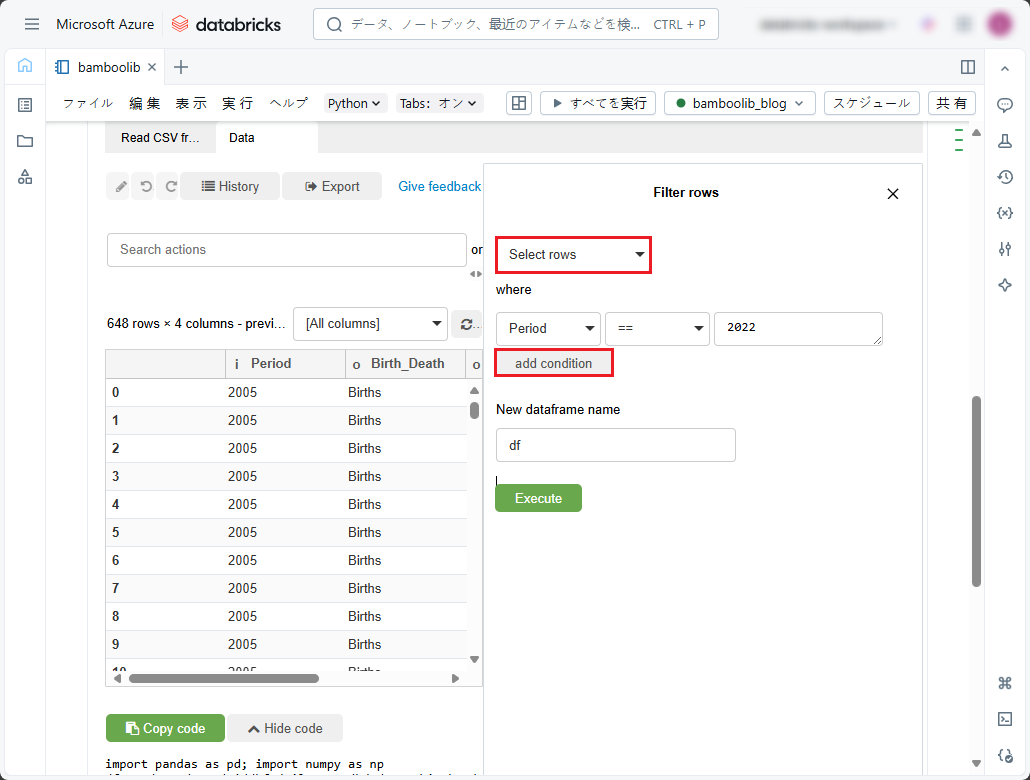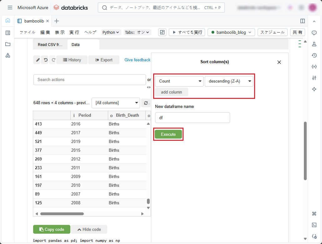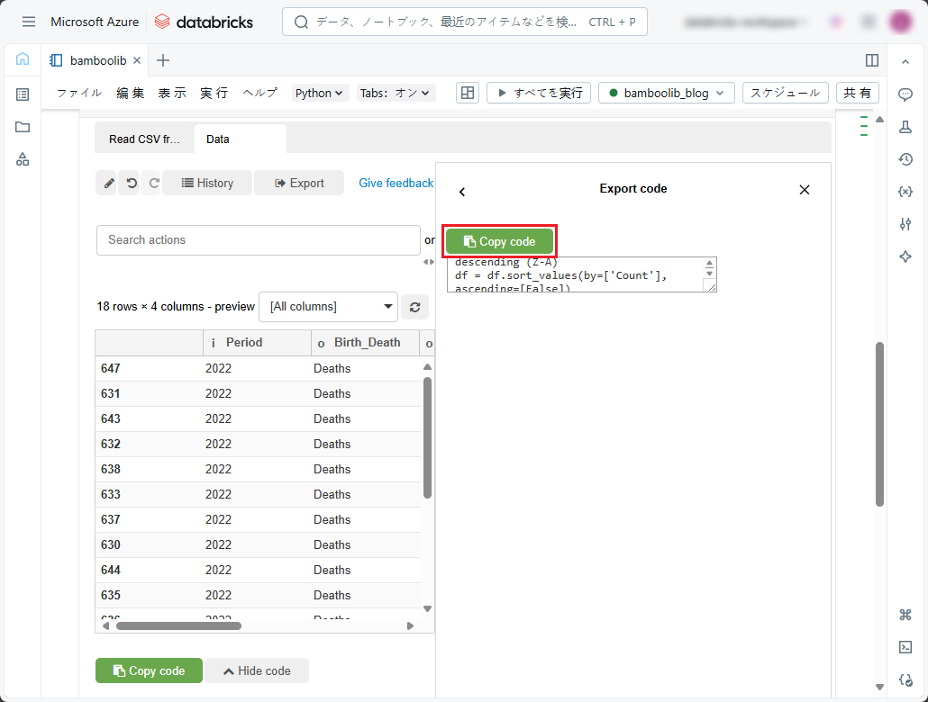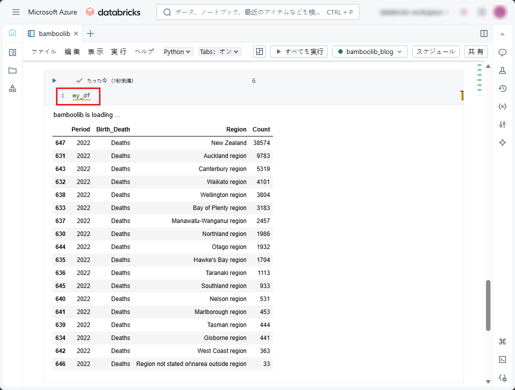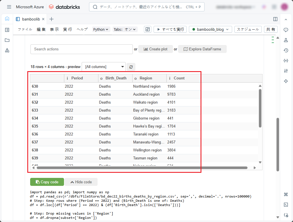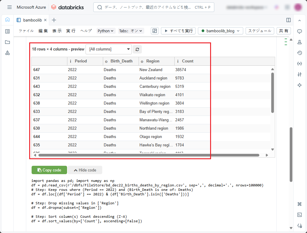 ① 以下のコードをコピーしてデータを表示し、ノートブックで実行します。