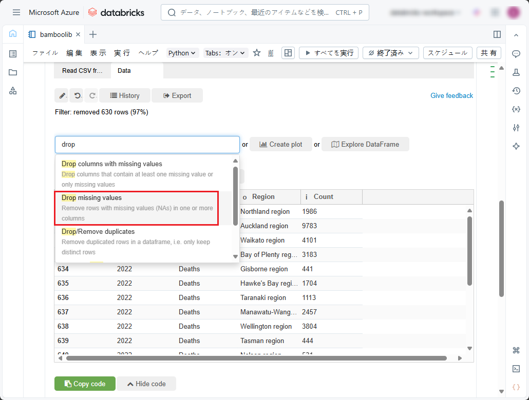 特定のカラムに欠損値がある行を削除したい場合(例えば、このデータセットでは「Region」カラムに欠損値の行を削除したい)、「Data」タブの「Search actions」ドロップダウンリストで以下の手順に従ってください。
