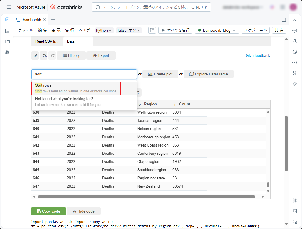 このデータセットは、2010年から2022年までの地域別の出生数と死亡数です。2022年のみの地域別の死亡数を降順で表示したい場合、「Data」タブの「Search actions」ドロップダウンリストで以下の手順に従ってください。