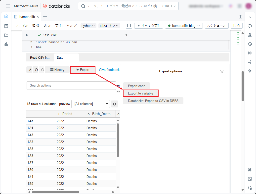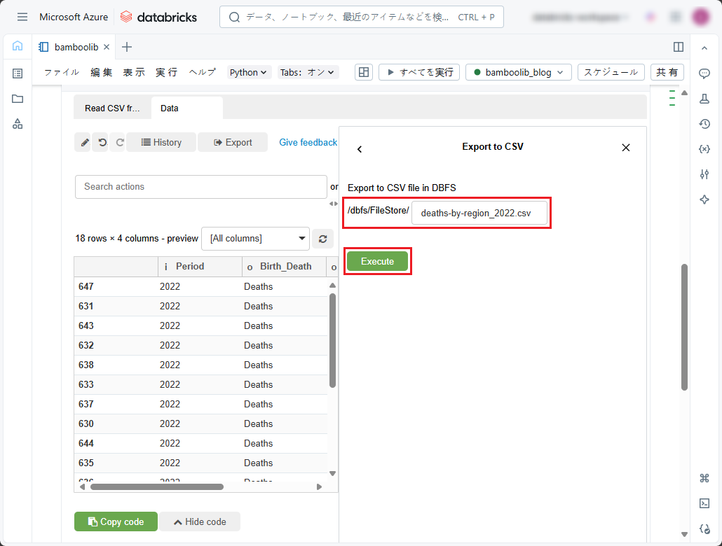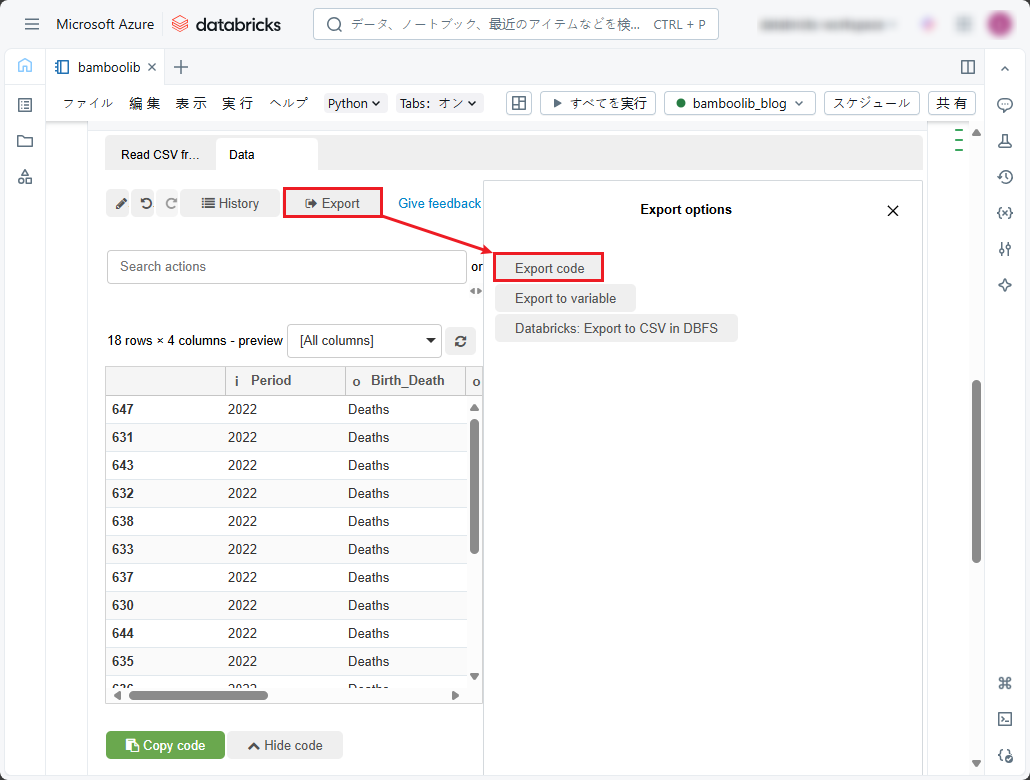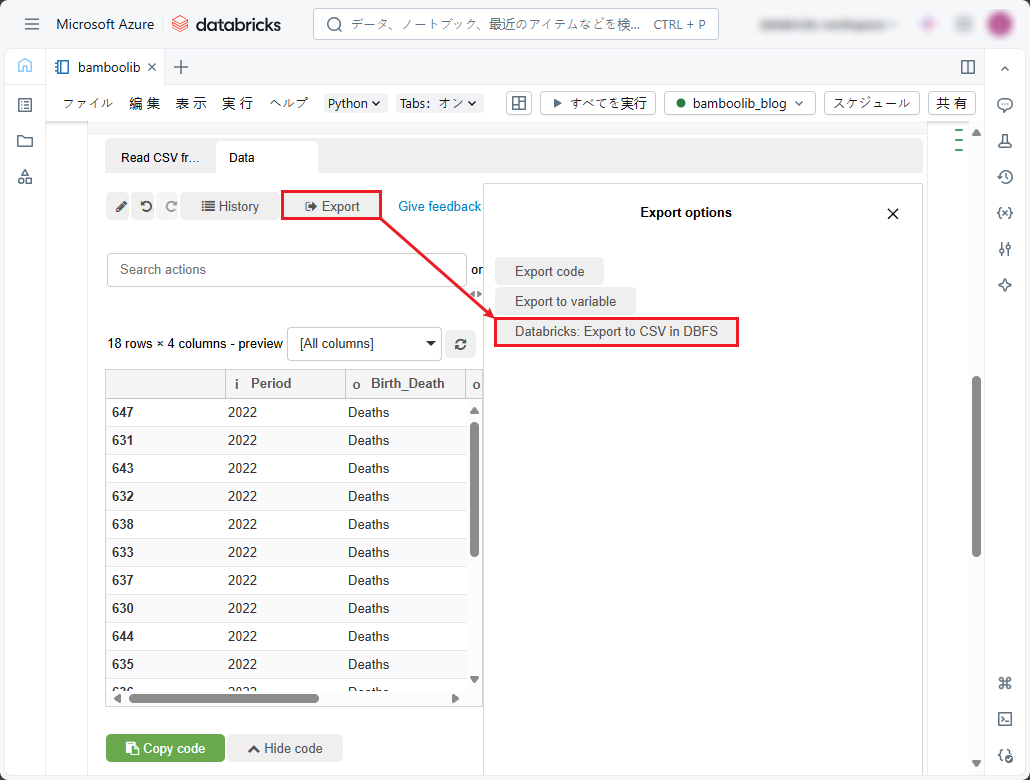 ①「Export」をクリックし、「Databricks: Export to CSV in DBFS」を選択します。