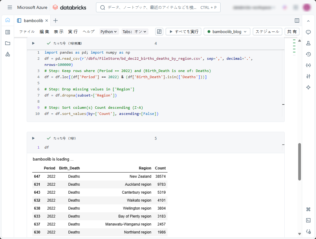 その後、実行後の結果を見ると、2022年のみの地域別の死亡数を降順で表示しました。