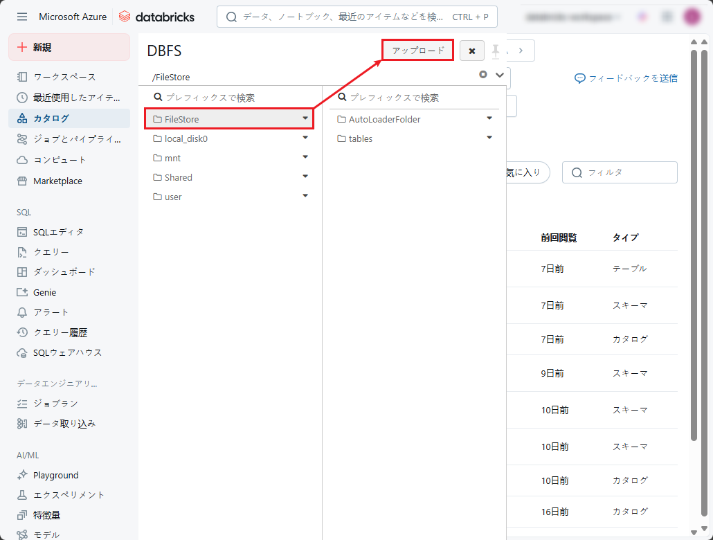 ④ DBFSから「FileStore」フォルダを選択し、「アップロード」をクリックします。