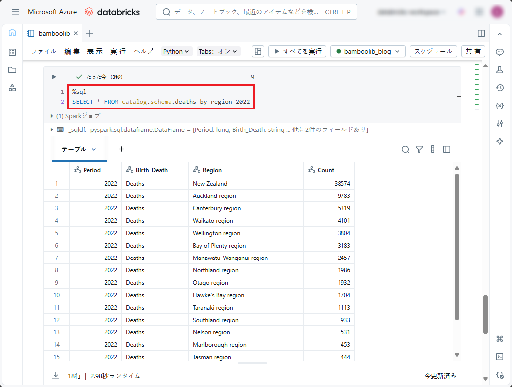 下記の SQLコマンドを実行して、DataFrameから保存したデルタ テーブルを表示します。