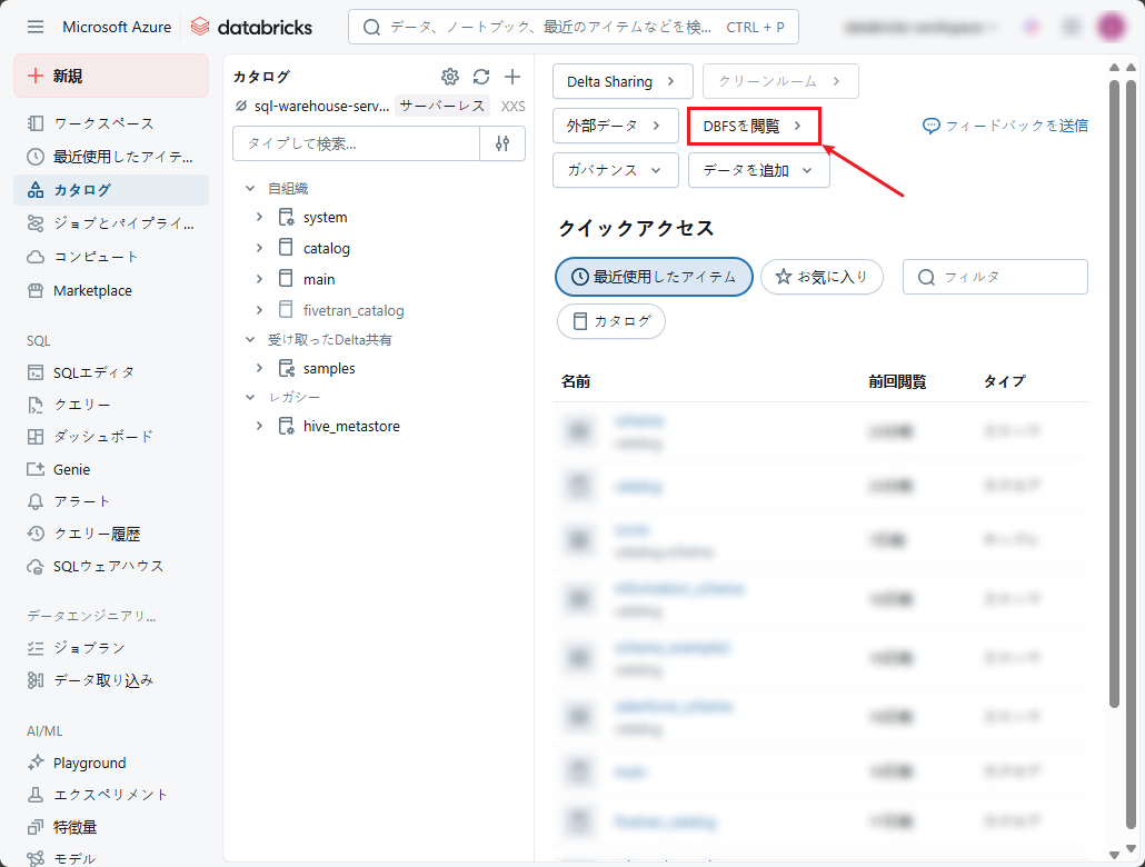 ③ データエクスプローラーから「DBFSを閲覧」を選択します。
