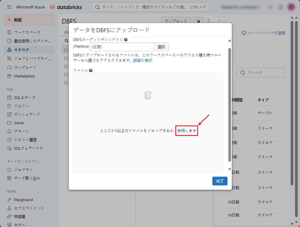⑤ 「データをDBFSにアップロード」ダイアログでローカルコンピューターからのファイルをアップロードできます。