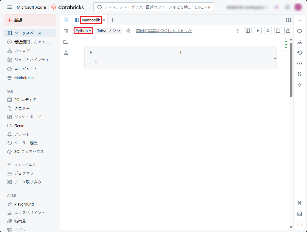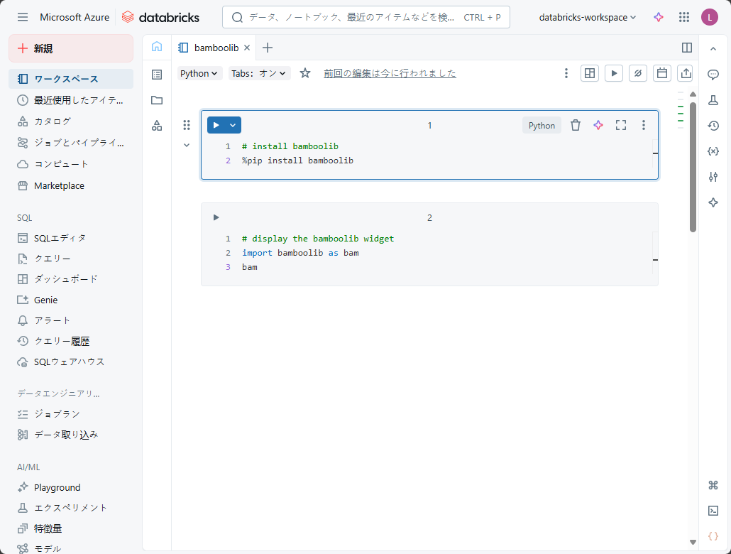 ③ 以下のコードをノートブックの1行目と2行目にコピーし、bamboolibライブラリをインストールします。