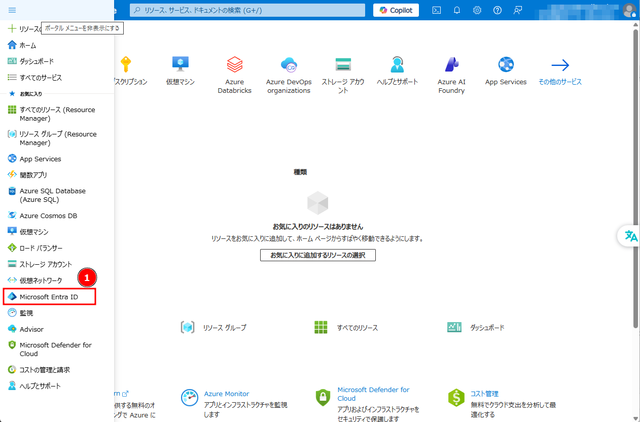 ① Azure Portalのサイドバーから「Microsoft Entra ID」をクリックします。