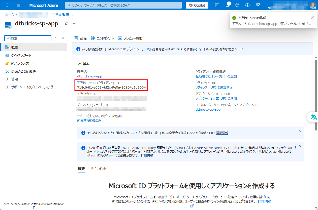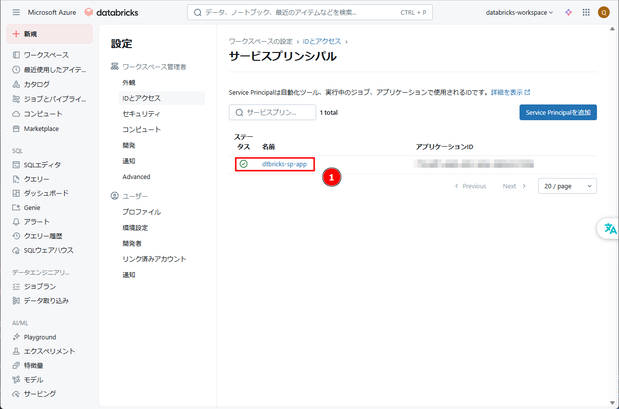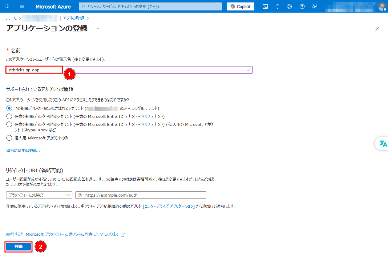③ アプリケーション名を入力し、「登録」ボタンをクリックします。例:「dtbricks-sp-app」
