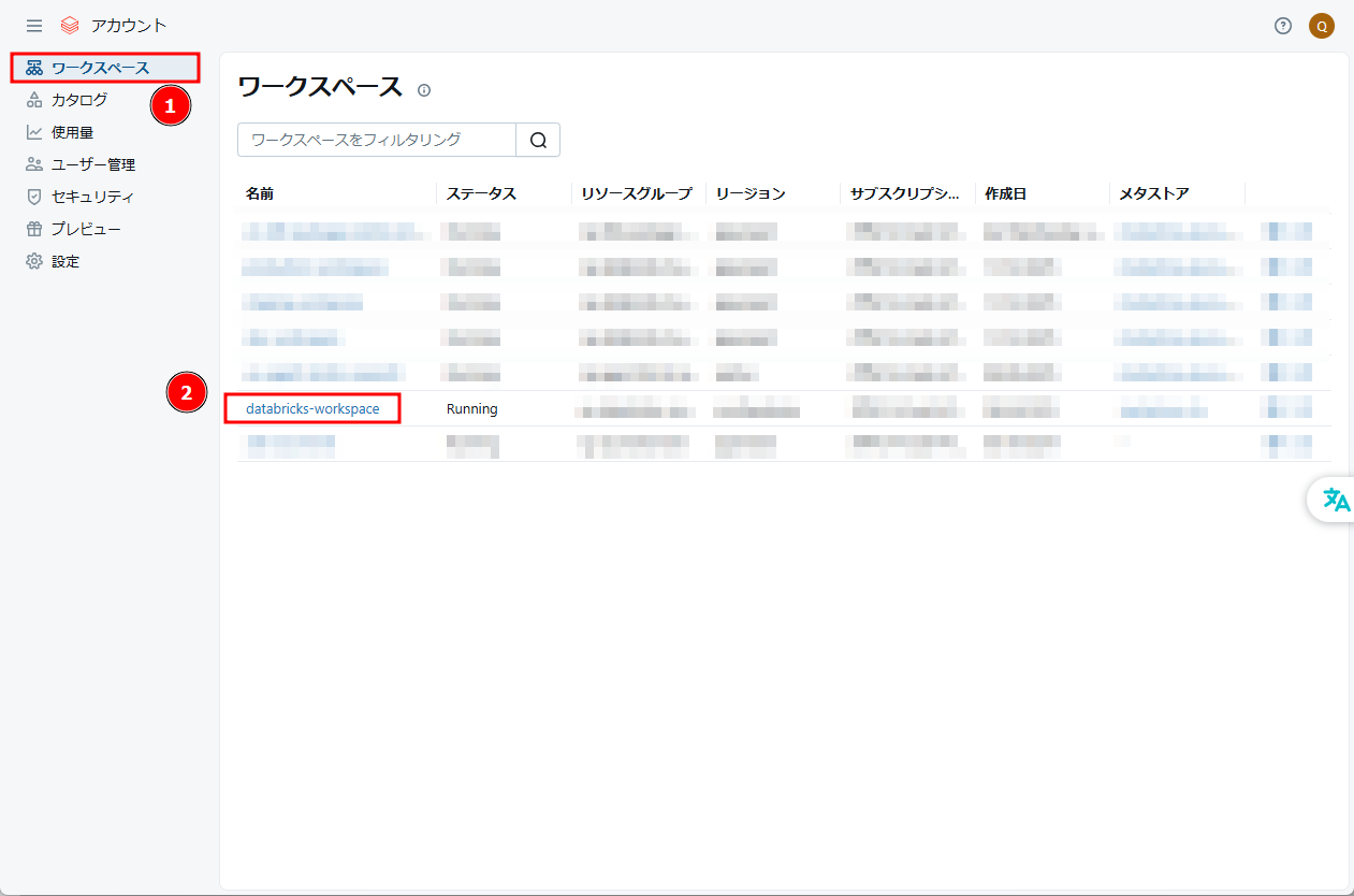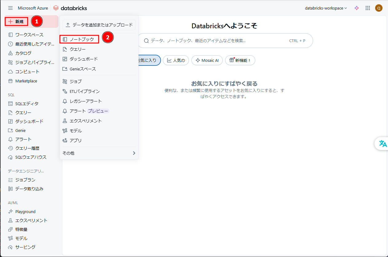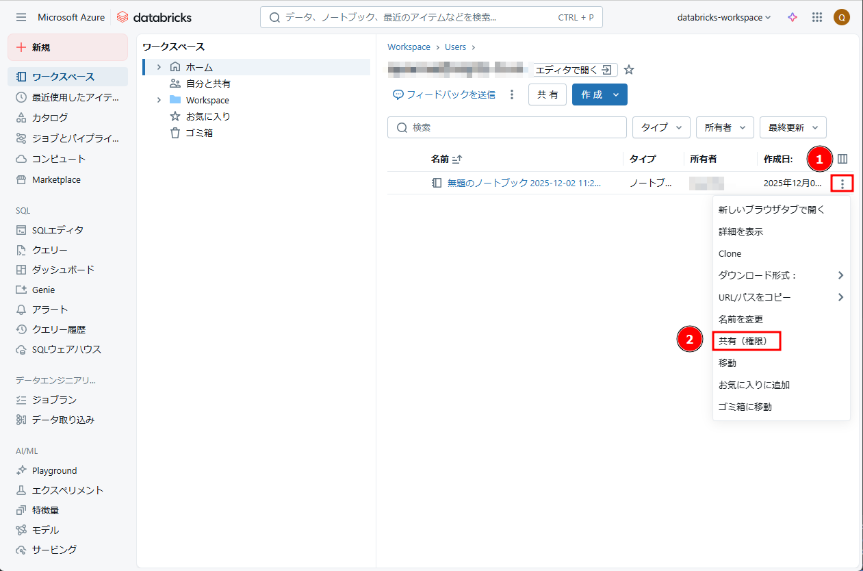 ③ サービスプリンシパルにノートブックの読込権限を付与する必要があります。サイドバーから「ワークスペース」をクリックし、作成したノートブックにマウスを移動します。
