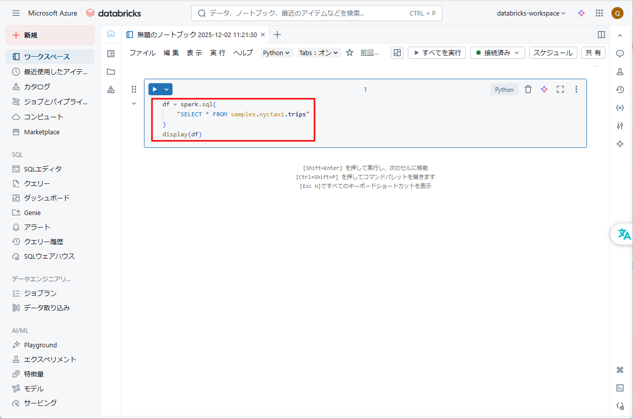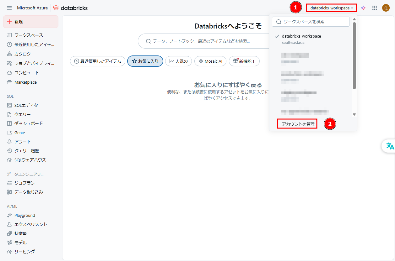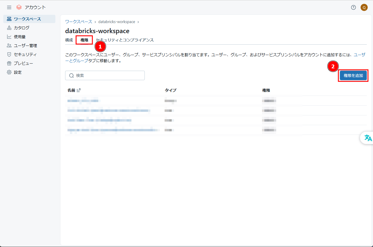 ③ サービスプリンシパルにノートブックの読込権限を付与する必要があります。サイドバーから「ワークスペース」をクリックし、作成したノートブックにマウスを移動します。