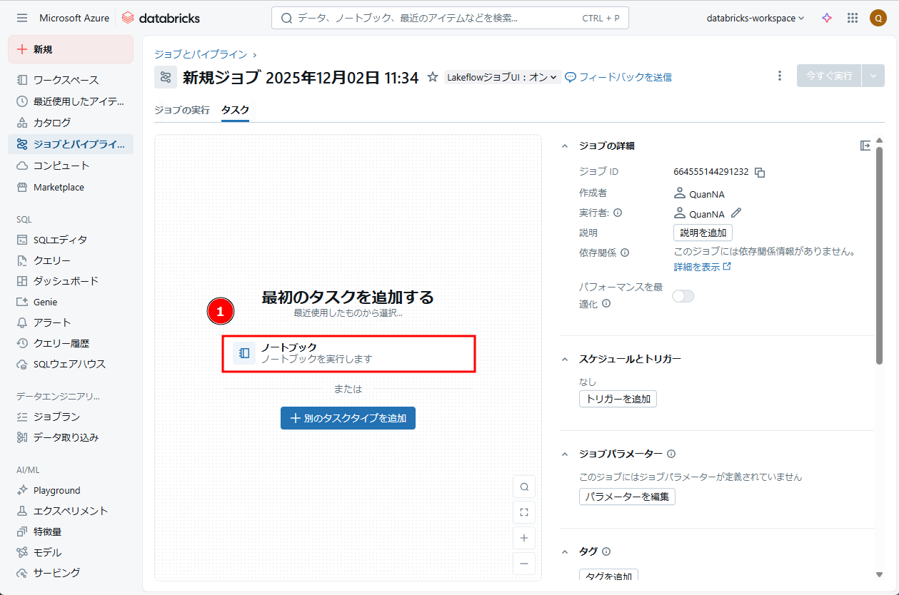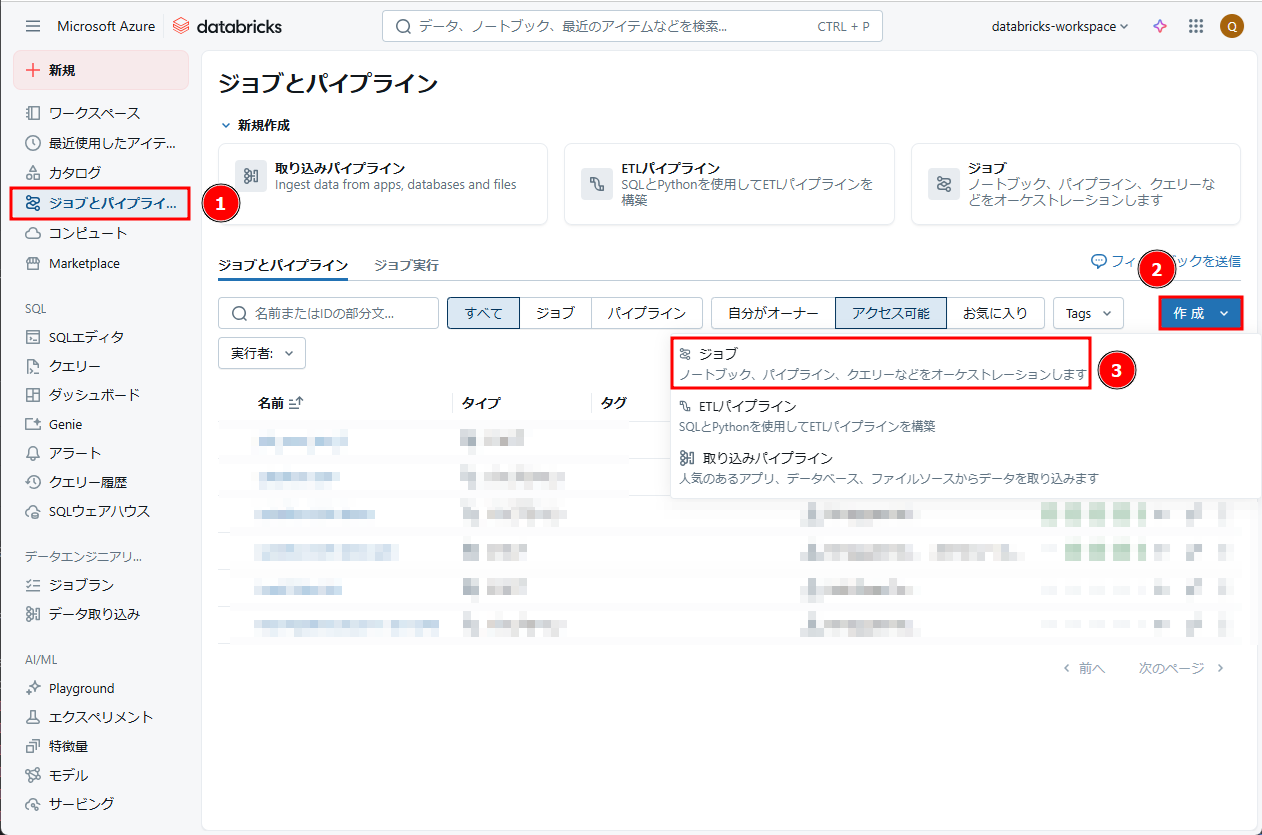 ① サイドバーから「ジョブとパイプライン」をクリックし、「作成」→「ジョブ」をクリックします。