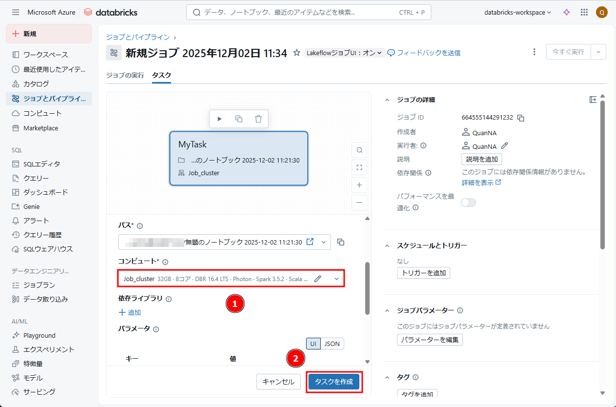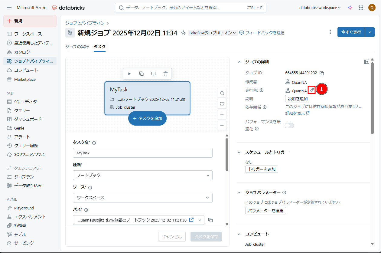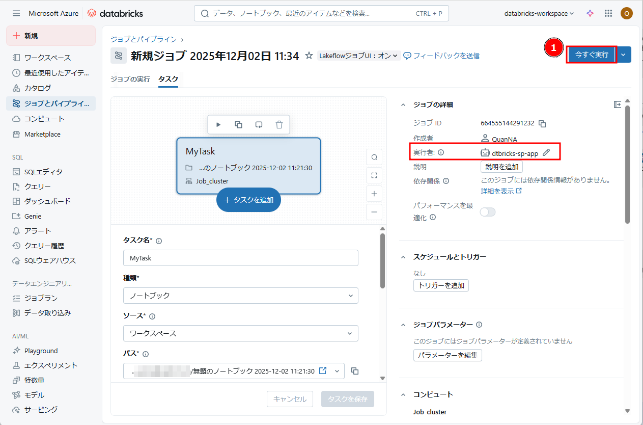 通常、ジョブ作成時には、ジョブ作成者のユーザIDを利用しDatabricksのジョブが実行されます。