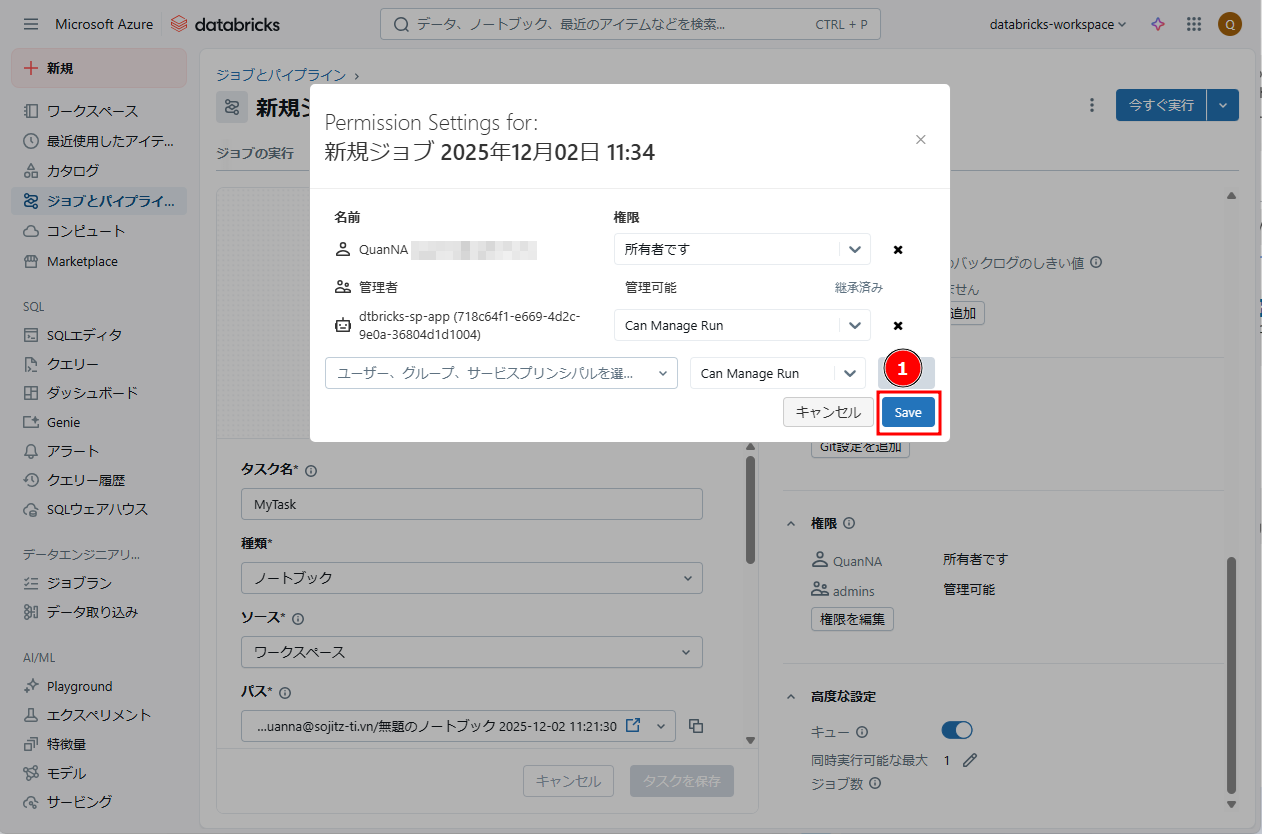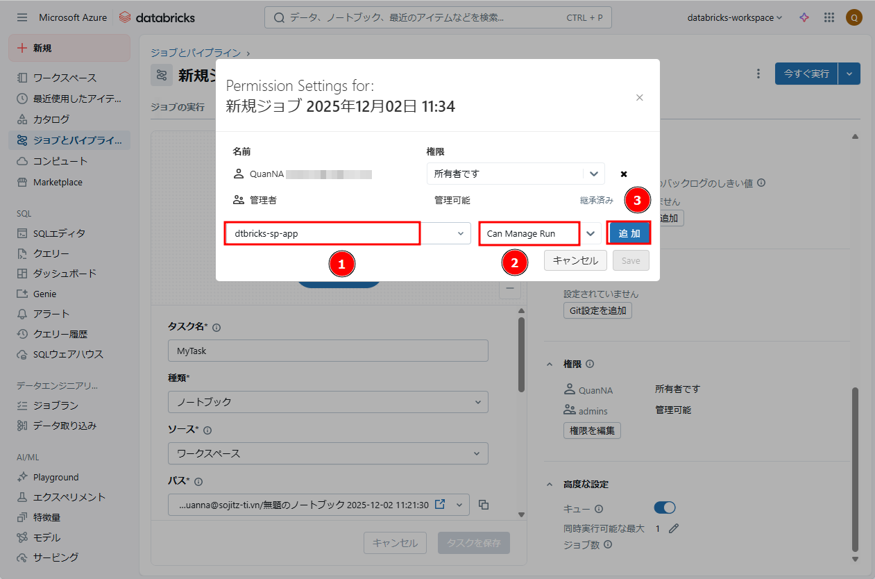 ジョブを実行できるように、サービスプリンシパルにクラスタの作成権限を付与する必要があります。