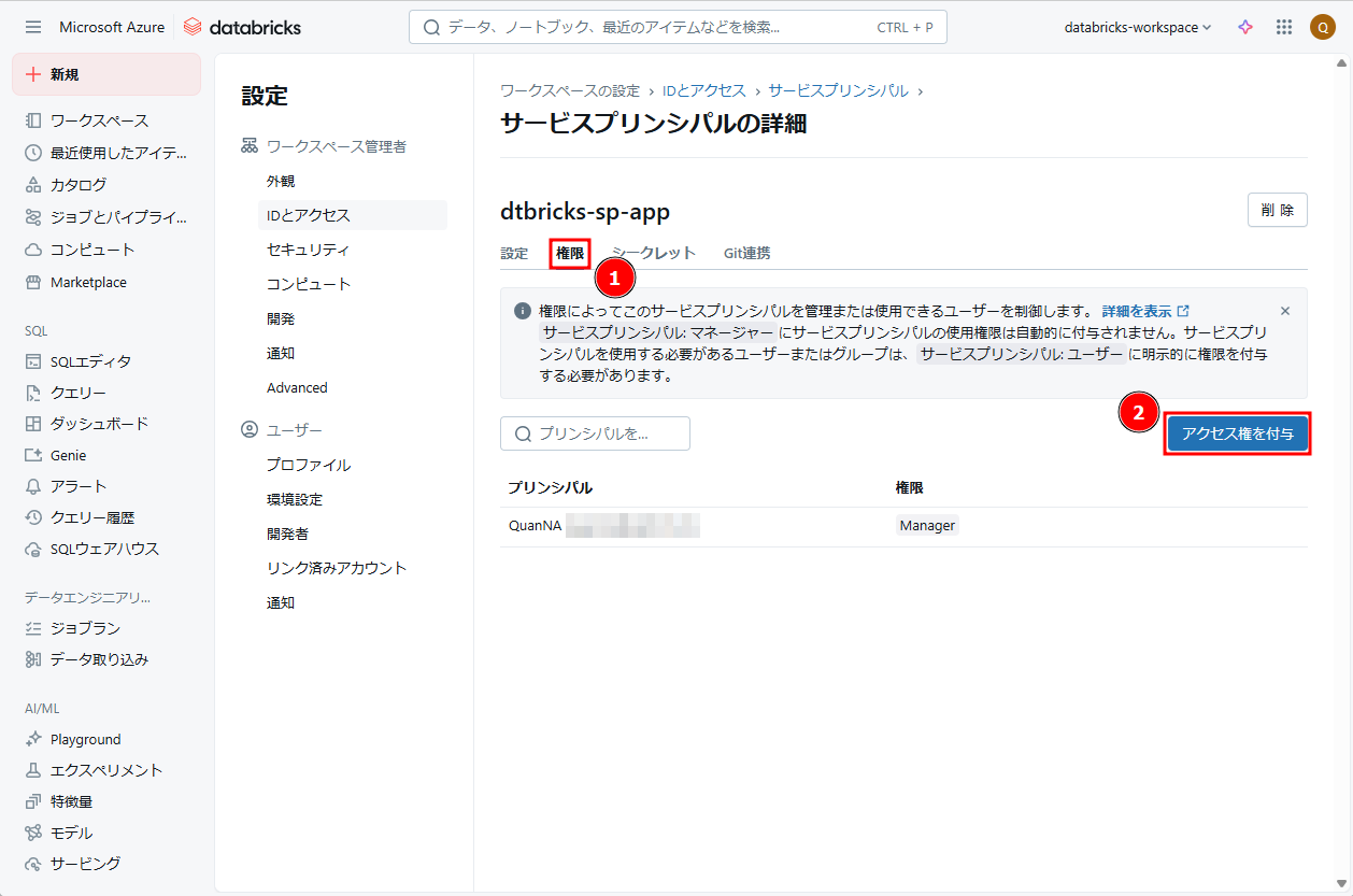 ③ 「IDとアクセス」タブでサービスプリンシパルの「管理」を選択します。