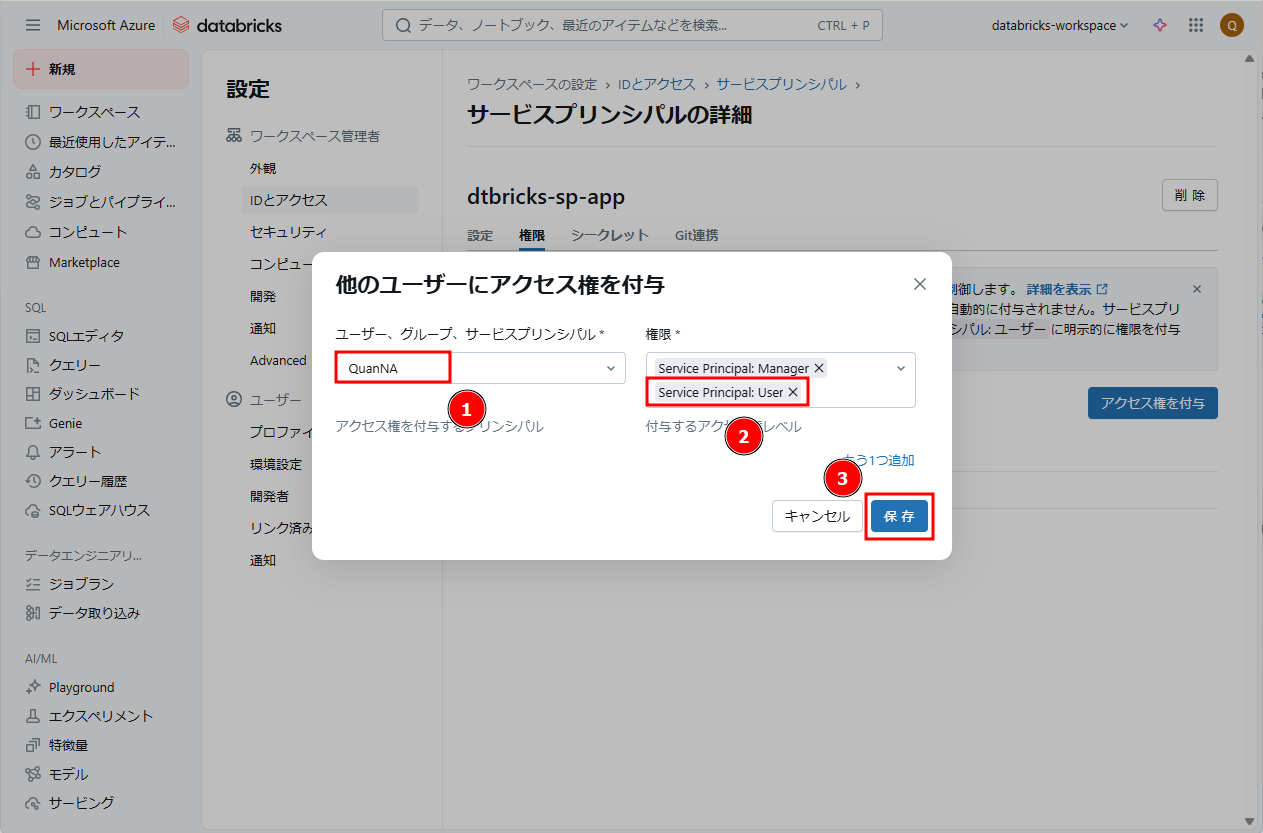 ⑧ 最初のドロップダウンでサービスプリンシパル名を選択し、2番目のドロップダウンで「User」を選択します。「保存」ボタンをクリックします。