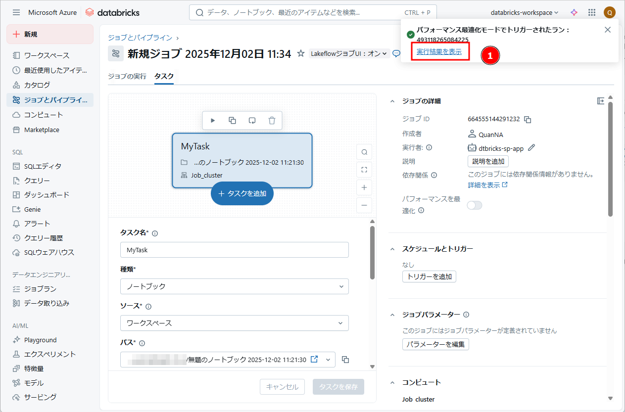 ⑩ 結果が画像のように表示されます。ジョブはサービスプリンシパルによって実行されます。