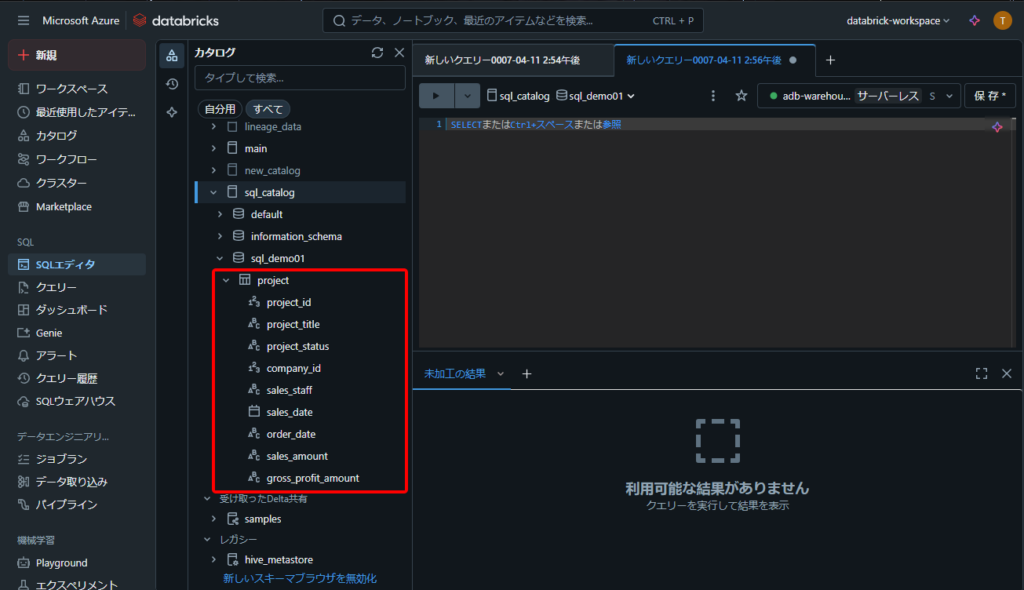 エディター領域でカタログとスキーマを変更することで、コード記述時にテーブル名の指定を簡素化することが可能です。