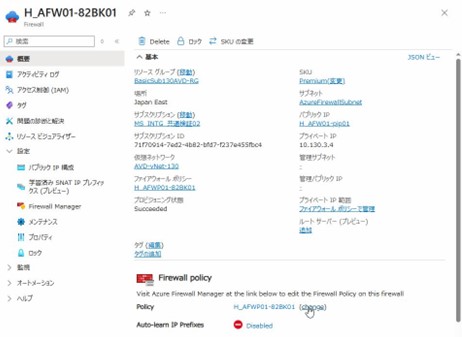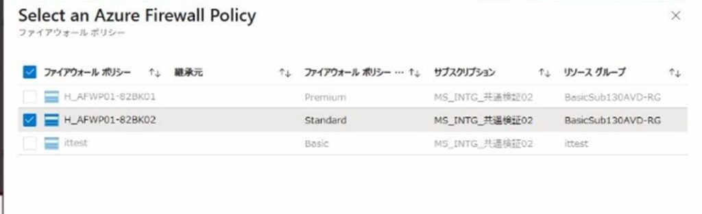 - ダウングレードしたい対象のAzure Firewall に紐づけられているAzure Firewall Premium ポリシーを、①で作成したStandardに切り替える。