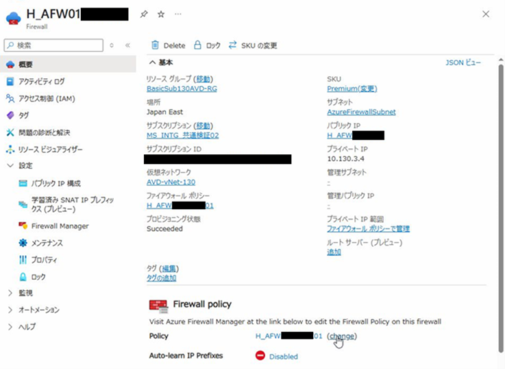 ② ダウングレードしたい対象のAzure Firewall に紐づけられているAzure Firewall Premium ポリシーを①で作成したStandardに切り替える。