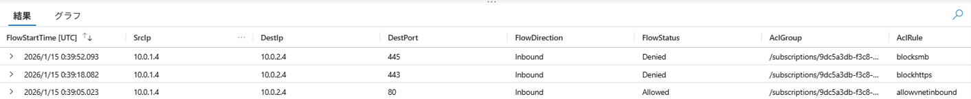 VNetフローログでは、80番ポートがAllowed、443・445番ポートがDeniedと正しく記録され、さらに AclGroup /AclRule の情報から「どの評価レイヤーで拒否されたか」を確認できます。