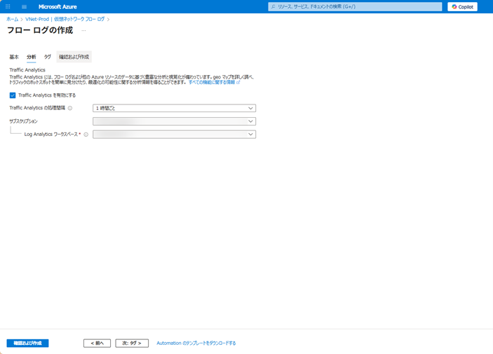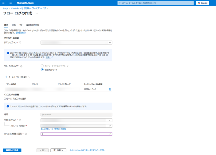図2.VNetフローログの設定画面1
