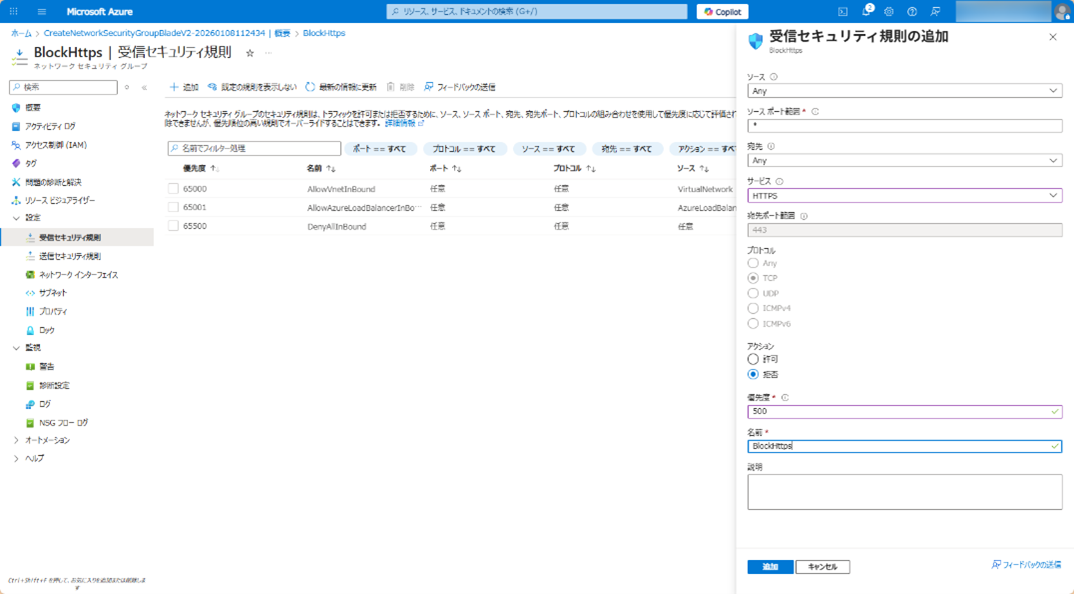 • NSGで 443 ポート Inbound を拒否(BlockedSubnet 側のみ配置)