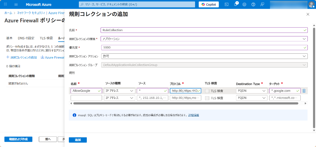• Azure Firewall アプリケーション規則で *.google.com 宛て Outbound を許可